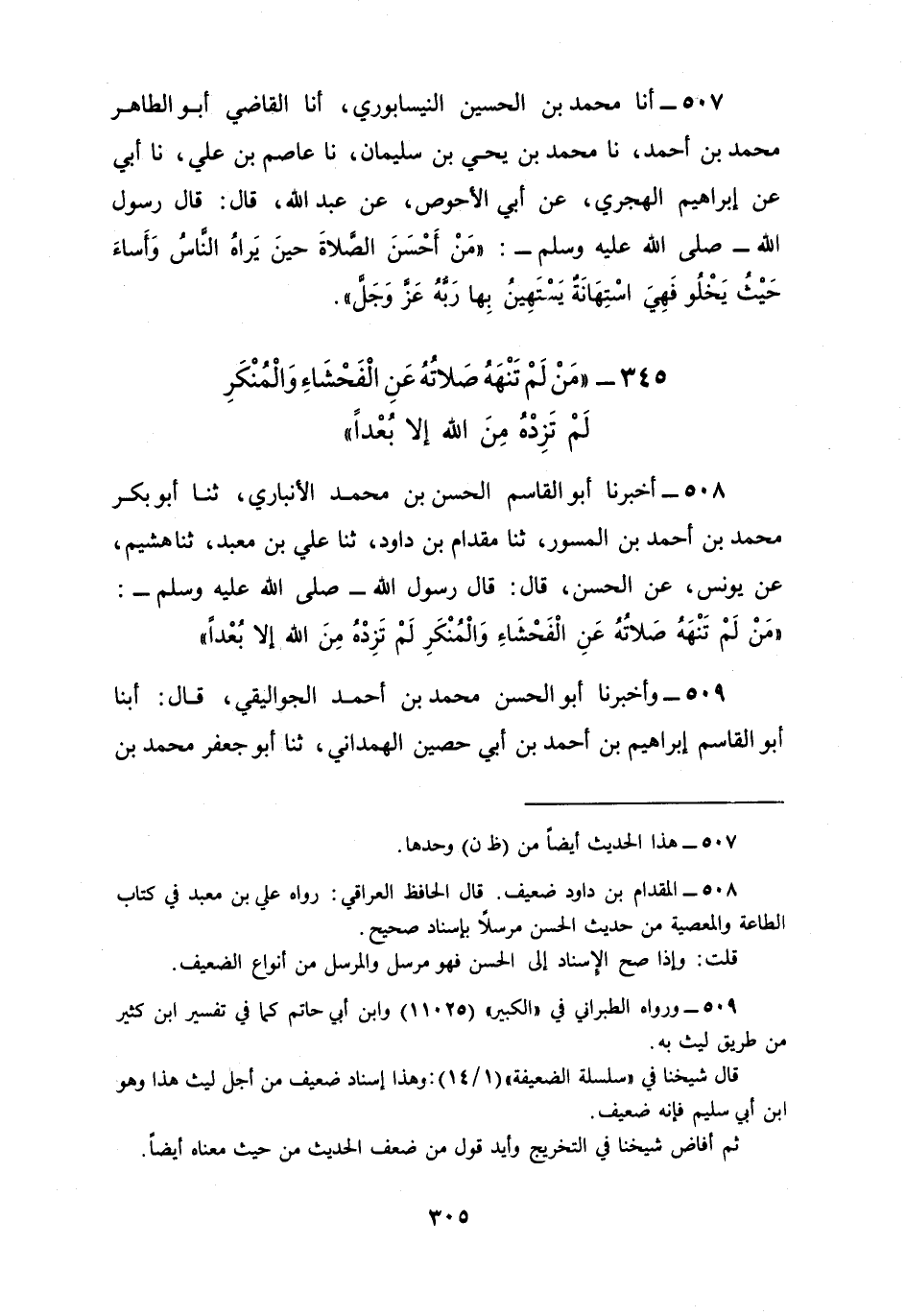 509 - وَأَخْبَرَنَا أَبُو الْحَسَنِ، مُحَمَّدُ بْنُ أَحْمَدَ الْجَوَالِيقِيُّ قَالَ: أبنا أَبُو الْقَاسِمِ إِبْرَاهِيمُ بْنُ أَحْمَدَ بْنِ أَبِي حُصَيْنٍ الْهَمْدَانِيُّ، ثنا أَبُو جَعْفَرٍ، مُحَمَّدُ بْنُ عَبْدِ اللَّهِ الْحَضْرَمِيُّ ثنا يَحْيَى بْنُ طَلْحَةَ أَبُو زَكَرِيَّا الْيَرْبُوعِيُّ، ثنا أَبُو مُعَاوِيَةَ، عَنْ لَيْثٍ، عَنْ طَاوُسٍ، عَنِ ابْنِ عَبَّاسٍ، قَالَ: قَالَ رَسُولُ اللَّهِ صَلَّى اللهُ عَلَيْهِ وَسَلَّمَ: §«مَنْ لَمْ تَنْهَهُ صَلَاتُهُ عَنِ الْفَحْشَاءِ وَالْمُنْكَرِ لَمْ يَزْدَدْ بِهَا مِنَ اللَّهِ إِلَّا بُعْدًا»