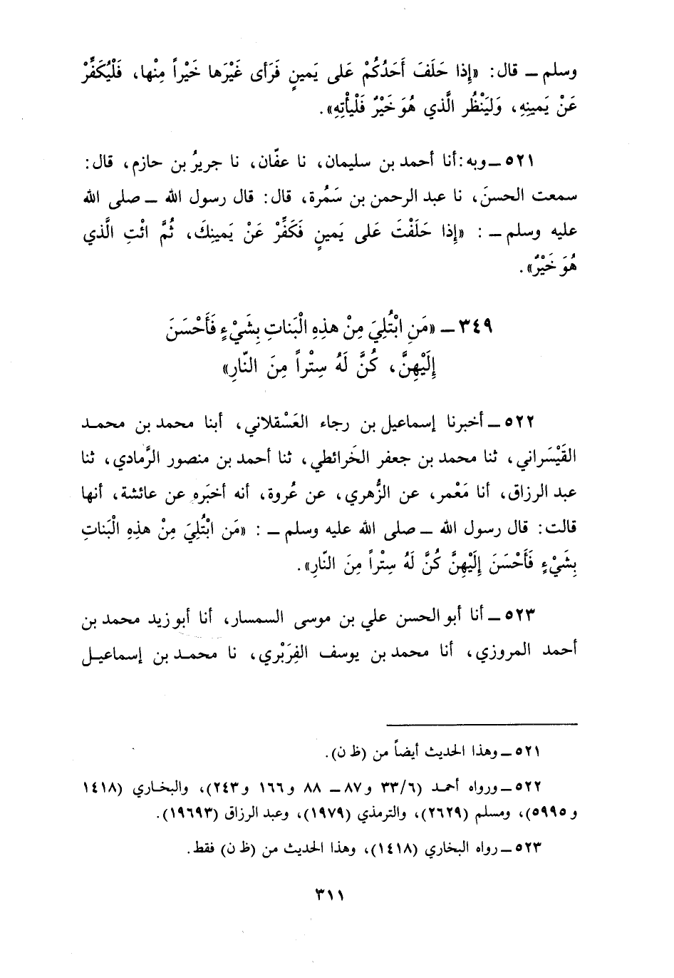 523 - أنا أَبُو الْحَسَنِ عَلِيُّ بْنُ مُوسَى السِّمْسَارُ، أنا أَبُو يَزِيدَ، مُحَمَّدُ بْنُ أَحْمَدَ الْمَرْوَزِيُّ أنا مُحَمَّدُ بْنُ يُوسُفَ الْفَرَبْرِيُّ، نا مُحَمَّدُ بْنُ إِسْمَاعِيلَ الْبُخَارِيُّ، نا بِشْرُ بْنُ مُحَمَّدٍ، أنا عَبْدُ اللَّهِ بْنُ الْمُبَارَكِ، أنا مَعْمَرٌ، عَنِ الزُّهْرِيِّ، حَدَّثَنِي عَبْدُ اللَّهِ بْنُ أَبِي بَكْرِ بْنِ حَزْمٍ، عَنْ عُرْوَةَ، عَنْ عَائِشَةَ، قَالَتْ: دَخَلَتِ امْرَأَةٌ مَعَهَا بِنْتَانِ لَهَا تَسْأَلُ فَلَمْ تَجِدْ عِنْدِي شَيْئًا غَيْرَ تَمْرَةٍ فَأَعْطَيْتُهَا إِيَّاهَا فَقَسَمَتْهَا بَيْنَ ابْنَتَيْهَا وَلَمْ تَأْكُلْ مِنْهَا، ثُمَّ قَامَتْ فَخَرَجَتْ فَدَخَلَ النَّبِيُّ صَلَّى اللهُ عَلَيْهِ وَسَلَّمَ فَأَخْبَرْتُهُ، فَقَالَ النَّبِيُّ صَلَّى اللهُ عَلَيْهِ وَسَلَّمَ: §«مَنِ ابْتُلِيَ مِنْ هَذِهِ الْبَنَاتِ بِشَيْءٍ كُنَّ لَهُ سِتْرًا مِنَ النَّارِ»