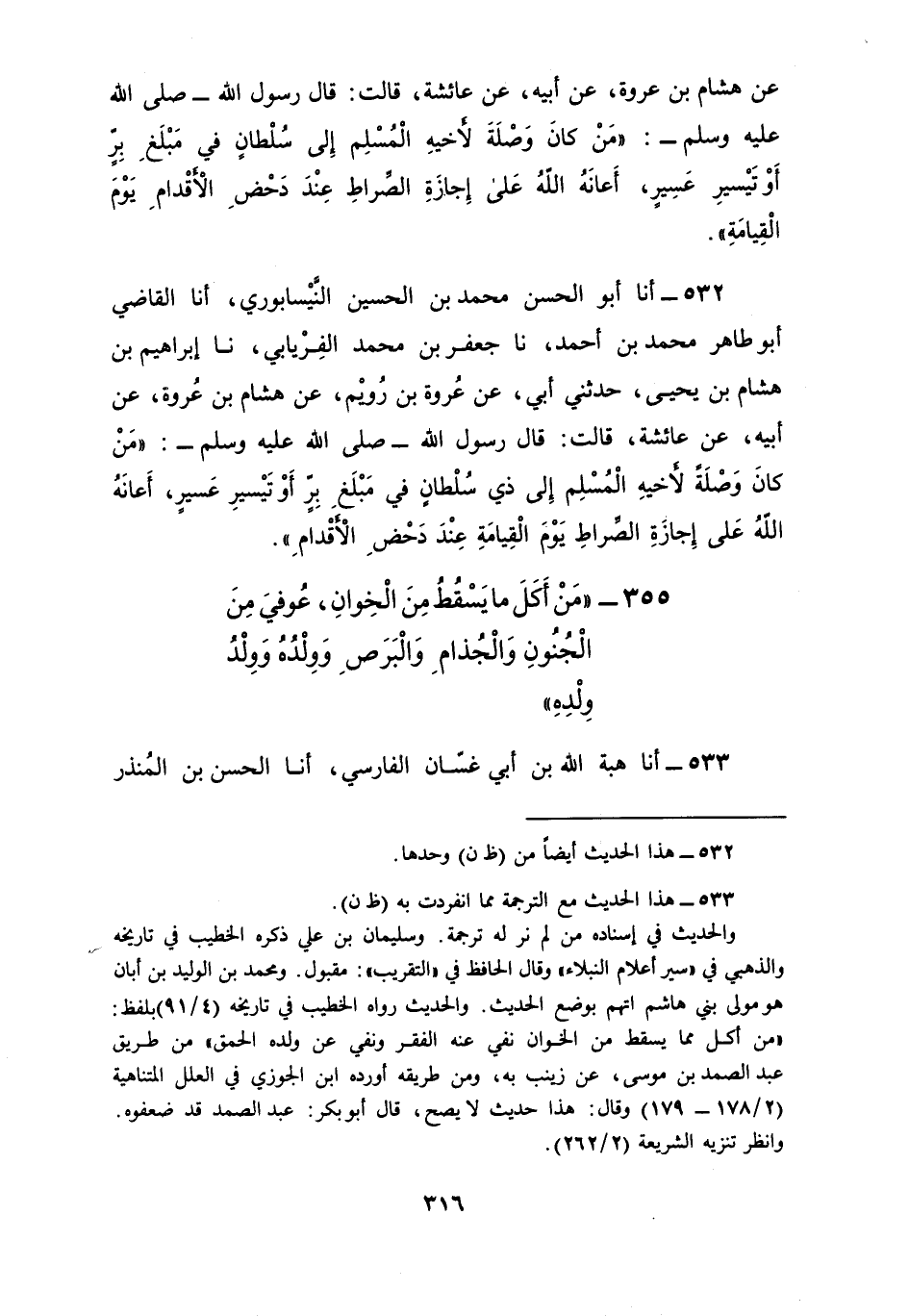 532 - أنا أَبُو الْحَسَنِ، مُحَمَّدُ بْنُ الْحُسَيْنِ النَّيْسَابُورِيُّ أنا الْقَاضِي أَبُو طَاهِرٍ، مُحَمَّدُ بْنُ أَحْمَدَ نا جَعْفَرُ بْنُ مُحَمَّدٍ الْفِرْيَابِيُّ، نا إِبْرَاهِيمُ بْنُ هِشَامِ بْنِ يَحْيَى، حَدَّثَنِي أَبِي، عَنْ عُرْوَةَ بْنِ رُوَيْمٍ، عَنْ هِشَامِ بْنِ عُرْوَةَ، عَنْ أَبِيهِ , عَنْ عَائِشَةَ، قَالَتْ: قَالَ رَسُولُ اللَّهِ صَلَّى اللهُ عَلَيْهِ وَسَلَّمَ: §«مَنْ كَانَ وَصْلَةً لِأَخِيهِ الْمُسْلِمِ إِلَى ذِي سُلْطَانٍ فِي مَبْلَغِ بِرٍّ أَوْ تَيْسِيرِ عَسِيرٍ أَعَانَهُ اللَّهُ عَلَى إِجَازَةِ الصِّرَاطِ يَوْمَ الْقِيَامَةِ عِنْدَ دَحْضِ الْأَقْدَامِ»