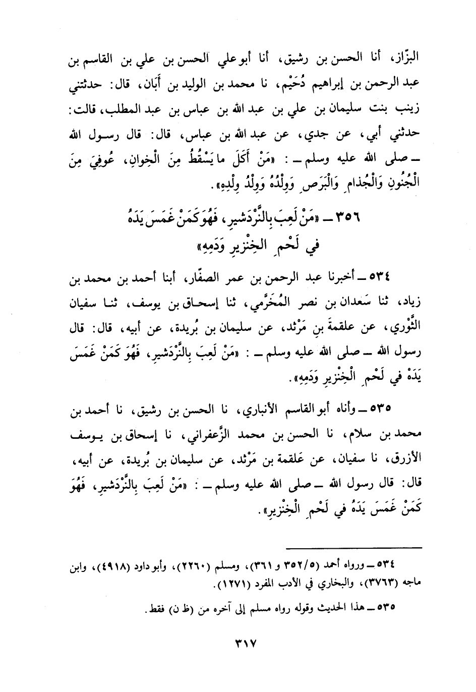 534 - أَخْبَرَنَا عَبْدُ الرَّحْمَنِ بْنُ عُمَرَ الصَّفَّارُ، أبنا أَحْمَدُ بْنُ مُحَمَّدِ بْنِ زِيَادٍ، ثنا سَعْدَانُ بْنُ نَصْرٍ الْمُخَرِّمِيُّ، ثنا إِسْحَاقُ بْنُ يُوسُفَ، ثنا سُفْيَانُ الثَّوْرِيُّ، عَنْ عَلْقَمَةَ بْنِ مَرْثَدٍ، عَنْ سُلَيْمَانَ بْنِ بُرَيْدَةَ، عَنْ أَبِيهِ، قَالَ: قَالَ رَسُولُ اللَّهِ صَلَّى اللهُ عَلَيْهِ وَسَلَّمَ: §«مَنْ لَعِبَ بِالنَّرْدَشِيرِ فَهُوَ كَمَنْ غَمَسَ يَدَهُ فِي لَحْمِ الْخِنْزِيرِ وَدَمِهِ»