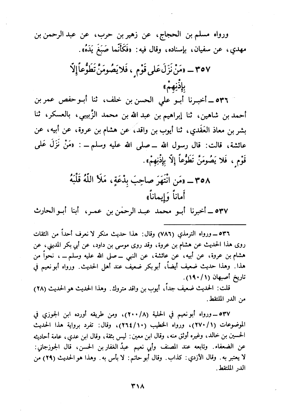 536 - أَخْبَرَنَا أَبُو عَلِيٍّ الْحَسَنُ بْنُ خَلَفٍ، ثنا أَبُو حَفْصٍ عُمَرُ بْنُ أَحْمَدَ بْنِ شَاهِينٍ، ثنا إِبْرَاهِيمُ بْنُ عَبْدِ اللَّهِ بْنِ مُحَمَّدٍ الزَّبَيبِيُّ، بِالْعَسْكَرِ، ثنا بِشْرُ بْنُ مُعَاذٍ الْعَقَدِيُّ، ثنا أَيُّوبُ بْنُ وَاقِدٍ، عَنْ هِشَامِ بْنِ عُرْوَةَ، عَنْ أَبِيهِ , عَنْ عَائِشَةَ، قَالَتْ: قَالَ رَسُولُ اللَّهِ صَلَّى اللهُ عَلَيْهِ وَسَلَّمَ: §«مَنْ نَزَلَ عَلَى قَوْمٍ فَلَا يَصُومَنَّ تَطَوُّعًا إِلَّا بِإِذْنِهِمْ»