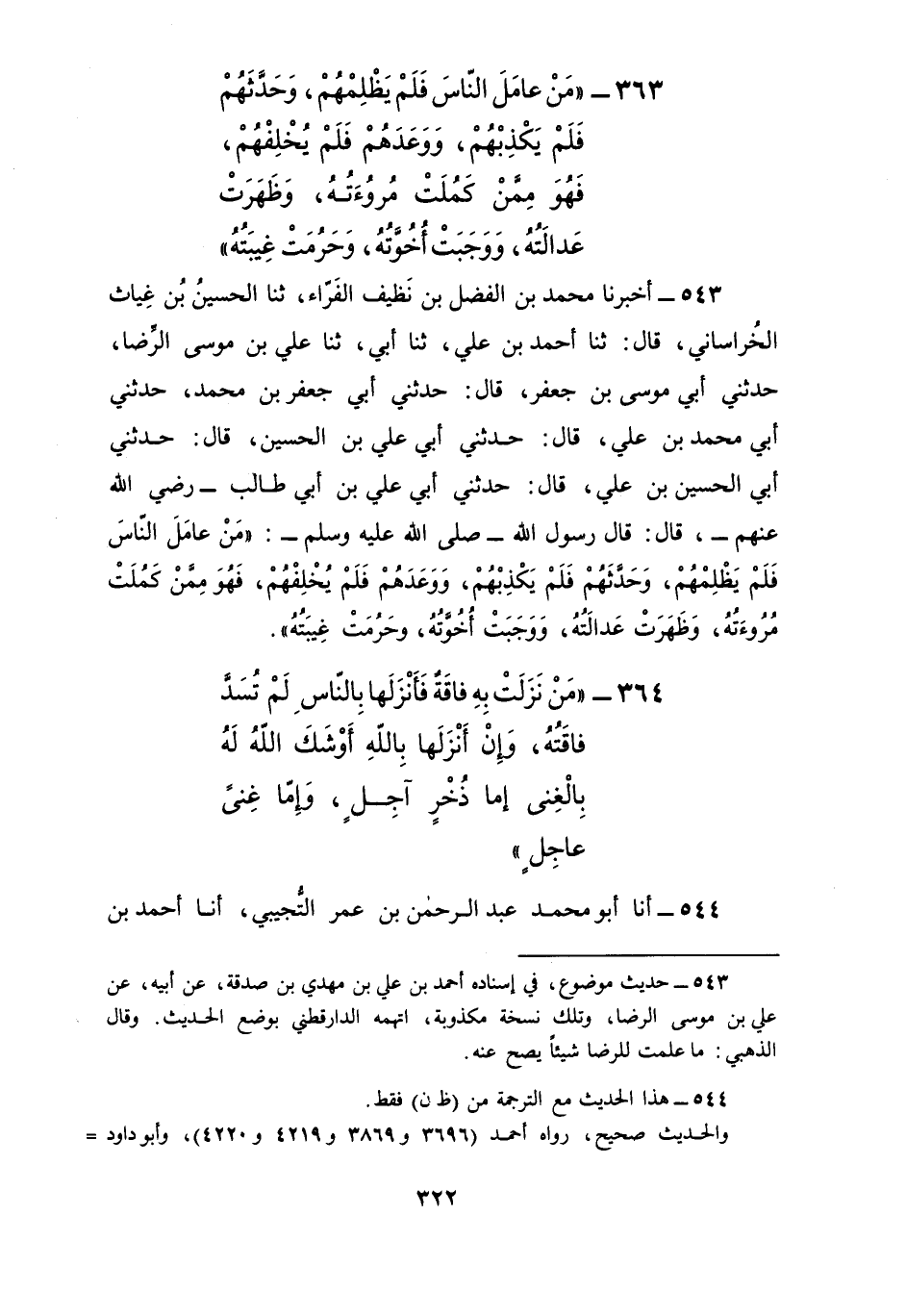 543 - أَخْبَرَنَا مُحَمَّدُ بْنُ الْفَضْلِ بْنِ نَظِيفٍ الْفَرَّاءُ، ثنا الْحُسَيْنُ بْنُ غِيَاثٍ الْخُرَاسَانِيُّ، قَالَ: ثنا أَحْمَدُ بْنُ عَلِيٍّ، ثنا أَبِي، ثنا عَلِيُّ بْنُ مُوسَى الرِّضَا، حَدَّثَنِي أَبِي مُوسَى بْنُ جَعْفَرٍ، قَالَ: حَدَّثَنِي أَبِي جَعْفَرُ بْنُ مُحَمَّدٍ، حَدَّثَنِي أَبِي مُحَمَّدُ بْنُ عَلِيٍّ، قَالَ: حَدَّثَنِي أَبِي عَلِيُّ بْنُ الْحُسَيْنِ، قَالَ: حَدَّثَنِي أَبِي الْحُسَيْنُ بْنُ عَلِيٍّ، قَالَ: حَدَّثَنِي أَبِي عَلِيُّ بْنُ أَبِي طَالِبٍ رَضِيَ اللَّهُ عَنْهُمْ قَالَ: قَالَ رَسُولُ اللَّهِ صَلَّى اللهُ عَلَيْهِ وَسَلَّمَ: «§مَنْ عَامَلَ النَّاسَ فَلَمْ يَظْلِمْهُمْ وَحَدَّثَهُمْ فَلَمْ يَكْذِبْهُمْ، وَوَعَدَهُمْ فَلَمْ يُخْلِفْهُمْ، فَهُوَ مِمَّنْ كَمُلَتْ مُرُوءَتُهُ، وَظَهَرَتْ عَدَالَتُهُ، وَوَجَبَتْ أُخُوَّتُهُ، وَحَرُمَتْ غَيْبَتُهُ»