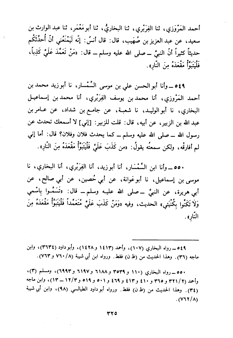549 - وأنا أَبُو الْحَسَنِ عَلِيُّ بْنُ مُوسَى السِّمْسَارُ، نا أَبُو زَيْدٍ، مُحَمَّدُ بْنُ أَحْمَدَ الْمَرْوَزِيُّ أنا مُحَمَّدُ بْنُ يُوسُفَ الْفَرَبْرِيُّ، أنا مُحَمَّدُ بْنُ إِسْمَاعِيلَ الْبُخَارِيُّ، نا أَبُو الْوَلِيدِ، نا شُعْبَةُ، عَنْ جَامِعِ بْنِ شَدَّادٍ، عَنْ عَامِرِ بْنِ عَبْدِ اللَّهِ بْنِ الزُّبَيْرِ، عَنْ أَبِيهِ، قَالَ: قُلْتُ لِلزُّبَيْرِ: إِنِّي لَا أَسْمَعُكُ تُحَدِّثُ عَنْ رَسُولِ اللَّهِ صَلَّى اللهُ عَلَيْهِ وَسَلَّمَ كَمَا يُحَدِّثُ فُلَانٌ وَفُلَانٌ، قَالَ: أَمَا إِنِّي لَمْ أُفَارِقْهُ وَلَكِنْ سَمِعْتُهُ يَقُولُ: §«مَنْ كَذَبَ عَلَيَّ فَلْيَتَبَوَّأْ مَقْعَدَهُ مِنَ النَّارِ»