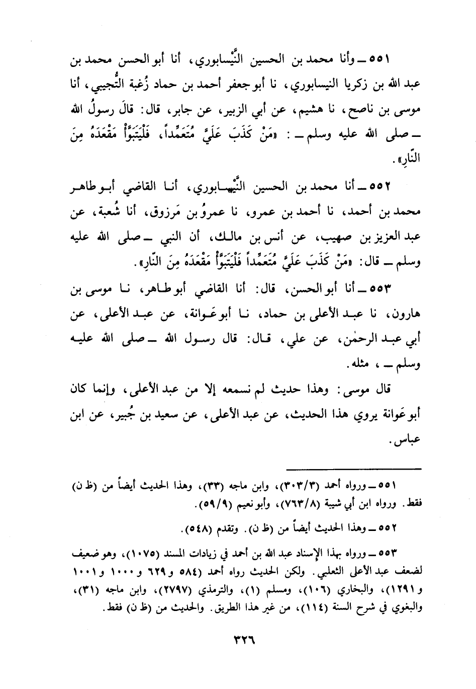 551 - وأنا مُحَمَّدُ بْنُ الْحُسَيْنِ النَّيْسَابُورِيُّ، أنا أَبُو الْحَسَنِ، مُحَمَّدُ بْنُ عَبْدِ اللَّهِ بْنِ زَكَرِيَّا النَّيْسَابُورِيُّ نا أَبُو جَعْفَرٍ أَحْمَدُ بْنُ حَمَّادٍ زُغْبَةُ التُّجِيبِيُّ أنا مُوسَى بْنُ نَاصِحٍ، نا هُشَيْمٌ، عَنْ أَبِي الزُّبَيْرِ , عَنْ جَابِرٍ، قَالَ: قَالَ رَسُولُ اللَّهِ صَلَّى اللهُ عَلَيْهِ وَسَلَّمَ: §«مَنْ كَذَبَ عَلَيَّ مُتَعَمِّدًا فَلْيَتَبَوَّأْ مَقْعَدَهُ مِنَ النَّارِ»