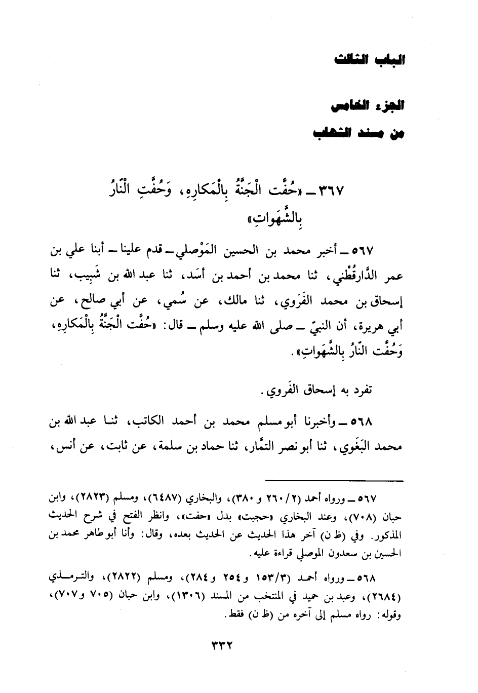 567 - أَخْبَرَ مُحَمَّدُ بْنُ الْحُسَيْنِ الْمَوْصِلِيُّ، قَدِمَ عَلَيْنَا، أبنا عَلِيُّ بْنُ عُمَرَ الدَّارَقُطْنِيُّ، ثنا مُحَمَّدُ بْنُ أَحْمَدَ بْنِ أَسَدٍ، ثنا عَبْدُ اللَّهِ بْنُ شَبِيبٍ، ثنا إِسْحَاقُ بْنُ مُحَمَّدٍ الْفَرْوِيُّ، ثنا مَالِكٌ، عَنْ سُمَيٍّ، عَنْ أَبِي صَالِحٍ , عَنْ أَبِي هُرَيْرَةَ، أَنَّ النَّبِيَّ صَلَّى اللهُ عَلَيْهِ وَسَلَّمَ قَالَ: §«حُفَّتِ الْجَنَّةُ بِالْمَكَارِهِ، وَحُفَّتِ النَّارُ بِالشَّهَوَاتِ» تَفَرَّدَ بِهِ إِسْحَاقُ الْفَرْوِيُّ
