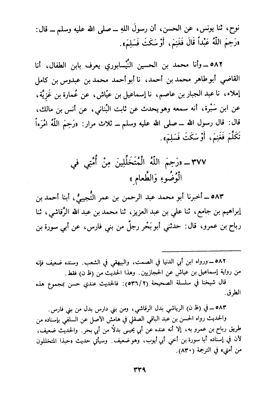 582 - وأنا مُحَمَّدُ بْنُ الْحُسَيْنِ النَّيْسَابُورِيُّ، يُعْرَفُ بِابْنِ الطَّفَّالِ، أنا الْقَاضِي أَبُو طَاهِرٍ، مُحَمَّدُ بْنُ أَحْمَدَ نا أَبُو أَحْمَدَ، مُحَمَّدُ بْنُ عَبْدُوسِ بْنِ كَامِلٍ إِمْلَاءً، نا عَبْدُ الْجَبَّارِ بْنُ عَاصِمٍ، نا إِسْمَاعِيلُ بْنُ عَيَّاشٍ، عَنْ عُمَارَةَ بْنِ غَزِيَّةَ، عَنِ ابْنِ سَبْرَةَ، أَنَّهُ سَمِعَهُ وَهُوَ يُحَدِّثُ عَنْ ثَابِتٍ الْبُنَانِيِّ، عَنْ أَنَسِ بْنِ مَالِكٍ، قَالَ: قَالَ رَسُولُ اللَّهِ صَلَّى اللهُ عَلَيْهِ وَسَلَّمَ ثَلَاثَ مِرَارٍ: «§رَحِمَ اللَّهُ امْرَءًا تَكَلَّمَ فَغَنِمَ، أَوْ سَكَتَ فَسَلِمَ»