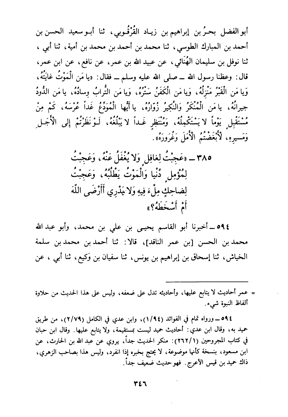594 - أَخْبَرَنَا أَبُو الْقَاسِمِ يَحْيَى بْنُ عَلِيِّ بْنِ مُحَمَّدٍ وَأَبُو عَبْدِ اللَّهِ مُحَمَّدُ بْنُ الْحَسَنِ بْنِ عُمَرَ النَّاقِدُ قَالَا: ثنا أَحْمَدُ بْنُ مُحَمَّدِ بْنِ سَلَمَةَ الْخَيَّاشُ، ثنا إِسْحَاقُ بْنُ إِبْرَاهِيمَ بْنِ يُونُسَ، ثنا سُفْيَانُ بْنُ وَكِيعٍ، ثنا أَبِي، عَنْ حُمَيْدٍ، عَنْ عَبْدِ اللَّهِ بْنِ الْحَارِثِ، عَنِ ابْنِ مَسْعُودٍ، قَالَ: قَالَ رَسُولُ اللَّهِ صَلَّى اللهُ عَلَيْهِ وَسَلَّمَ: «§عَجِبْتُ لِغَافِلٍ وَلَا يُغْفَلُ عَنْهُ، وَعَجِبْتُ لِمَؤَمِّلٍ دُنْيَا وَالْمَوْتُ يَطْلُبُهُ، وَعَجِبْتُ لِضَاحِكٍ مِلْءَ فِيهِ وَلَا يَدْرِي أَأَرْضَى اللَّهَ أَمْ أَسْخَطَهُ؟»