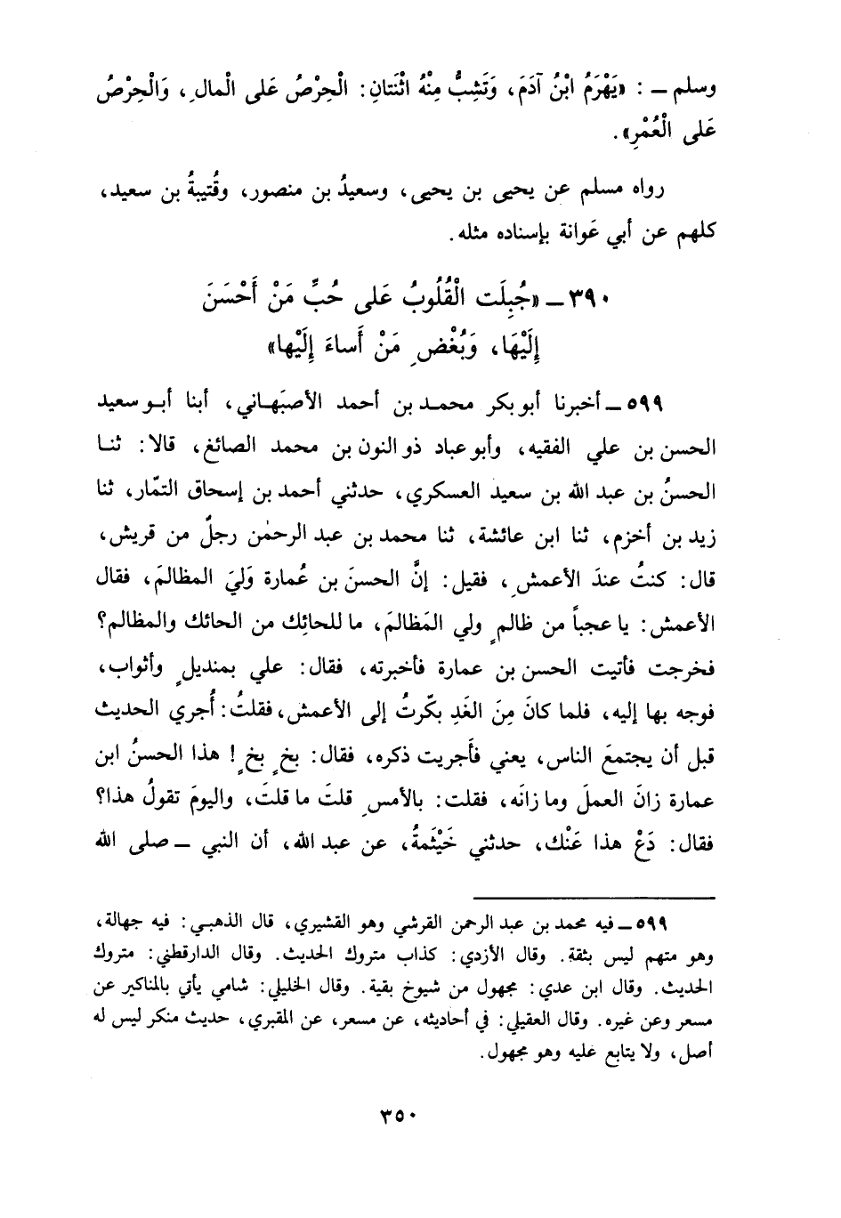 599 - أَخْبَرَنَا أَبُو بَكْرٍ مُحَمَّدُ بْنُ أَحْمَدَ الْأَصْبَهَانِيُّ، أبنا أَبُو سَعِيدٍ الْحَسَنُ بْنُ عَلِيٍّ الْفَقِيهُ، وَأَبُو عَبَّادٍ ذُو النُّونِ بْنُ مُحَمَّدٍ الصَّائِغُ قَالَا: ثنا الْحَسَنُ بْنُ عَبْدِ اللَّهِ بْنِ سَعِيدٍ الْعَسْكَرِيُّ، حَدَّثَنِي أَحْمَدُ بْنُ إِسْحَاقَ التَّمَّارُ، ثنا زَيْدُ بْنُ أَخْزَمَ، ثنا ابْنُ عَائِشَةَ، ثنا مُحَمَّدُ بْنُ عَبْدِ الرَّحْمَنِ رَجُلٌ مِنْ قُرَيْشٍ قَالَ: كُنْتُ عِنْدَ الْأَعْمَشِ فَقِيلَ: إِنَّ الْحَسَنَ بْنَ عُمَارَةَ وَلِيَ الْمَظَالِمَ، فَقَالَ الْأَعْمَشُ: يَا عَجَبًا مِنْ ظَالِمٍ وَلِيَ الْمَظَالِمَ، مَا لِلْحَائِكِ مِنَ الْحَائِكِ وَالْمَظَالِمِ؟، فَخَرَجْتُ فَأَتَيْتُ الْحَسَنَ بْنَ عُمَارَةَ فَأَخْبَرْتُهُ فَقَالَ: عَلَيَّ بِمِنْدِيلٍ وَأَثْوَابٍ فَوَجَّهَ بِهَا إِلَيْهِ فَلَمَّا كَانَ مِنَ الْغَدِ بَكَّرْتُ إِلَى الْأَعْمَشِ فَقُلْتُ: أُجْرِي الْحَدِيثَ قَبْلَ أَنْ يَجْتَمِعَ النَّاسُ يَعْنِي: فَأَجْرَيْتُ ذِكْرَهُ، فَقَالَ: بَخٍ بَخٍ، هَذَا الْحَسَنُ بْنُ عُمَارَةَ زَانَ الْعَمَلَ وَمَا زَانَهُ، فَقُلْتُ: بِالْأَمْسِ قُلْتَ مَا قُلْتَ، وَالْيَوْمُ تَقُولُ هَذَا، فَقَالَ: دَعْ هَذَا عَنْكَ، حَدَّثَنِي خَيْثَمَةُ , عَنْ عَبْدِ اللَّهِ أَنَّ النَّبِيَّ صَلَّى اللهُ عَلَيْهِ وَسَلَّمَ قَالَ: «§جُبِلَتِ الْقُلُوبُ عَلَى حُبِّ مَنْ أَحْسَنَ إَلَيْهَا، وَعَلَى بُغْضِ مَنْ أَسَاءَ إِلَيْهَا»