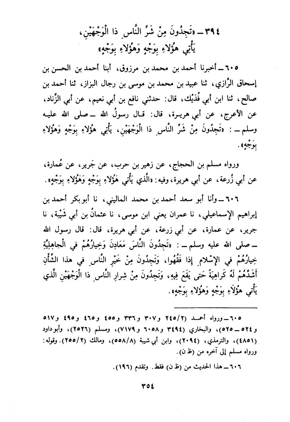 605 - أَخْبَرَنَا أَحْمَدُ بْنُ مُحَمَّدِ بْنِ مَرْزُوقٍ، أبنا أَحْمَدُ بْنُ الْحَسَنِ بْنِ إِسْحَاقَ الرَّازِيُّ، ثنا عُبَيْدُ بْنُ مُحَمَّدِ بْنِ مُوسَى بْنِ رِجَالٍ الْبَزَّازُ، ثنا أَحْمَدُ بْنُ صَالِحٍ، ثنا ابْنُ أَبِي فُدَيْكٍ، قَالَ: حَدَّثَنِي نَافِعُ بْنُ أَبِي نُعَيْمٍ، عَنْ أَبِي الزِّنَادِ، عَنِ الْأَعْرَجِ , عَنْ أَبِي هُرَيْرَةَ، قَالَ: قَالَ رَسُولُ اللَّهِ صَلَّى اللهُ عَلَيْهِ وَسَلَّمَ: §«تَجِدُونَ مِنْ شَرِّ النَّاسِ ذَا الْوَجْهَيْنِ يَأْتِي هَؤُلَاءِ بِوَجْهٍ وَهَؤُلَاءِ بِوَجْهٍ» وَرَوَاهُ مُسْلِمُ بْنُ الْحَجَّاجِ، عَنْ زُهَيْرِ بْنِ حَرْبٍ، عَنْ جَرِيرٍ، عَنْ عُمَارَةَ، عَنْ أَبِي زُرْعَةَ، عَنْ أَبِي هُرَيْرَةَ. وَفِيهِ: «الَّذِي يَأْتِي هَؤُلَاءِ بِوَجْهٍ وَهَؤُلَاءِ بِوَجْهٍ»