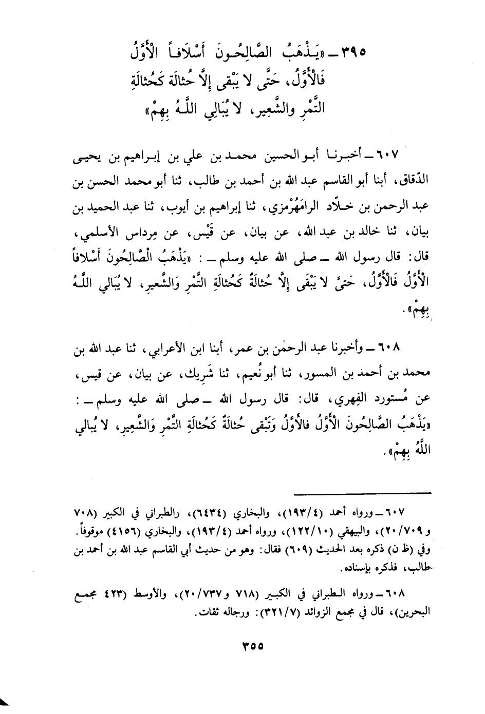 608 - وَأَخْبَرَنَا عَبْدُ الرَّحْمَنِ بْنُ عُمَرَ، أبنا ابْنُ الْأَعْرَابِيِّ، ثنا عَبْدُ اللَّهِ بْنُ مُحَمَّدِ بْنِ أَحْمَدَ بْنِ الْمِسْوَرِ، ثنا أَبُو نُعَيْمٍ، ثنا شَرِيكٌ، عَنْ بَيَانٍ، عَنْ قَيْسٍ , عَنْ مُسْتَوْرِدٍ الْفِهْرِيِّ، قَالَ: قَالَ رَسُولُ اللَّهِ صَلَّى اللهُ عَلَيْهِ وَسَلَّمَ: §«يَذْهَبُ الصَّالِحُونَ الْأَوَّلُ فَالْأَوَّلُ وَتَبْقَى حُثَالَةٌ كَحُثَالَةِ التَّمْرِ وَالشَّعِيرِ لَا يُبَالِي اللَّهُ بِهِمْ»