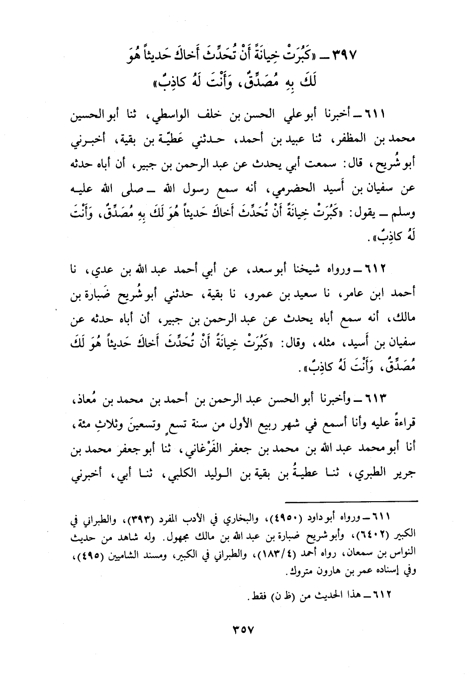612 - وَرَوَاهُ شَيْخُنَا أَبُو سَعْدٍ , عَنْ أَبِي أَحْمَدَ عَبْدِ اللَّهِ بْنِ عَدِيٍّ، نا أَحْمَدُ بْنُ عَامِرٍ نا سَعِيدُ بْنُ عَمْرٍو، نا بَقِيَّةُ، حَدَّثَنِي أَبُو شُرَيْحٍ ضُبَارَةُ بْنُ مَالِكٍ أَنَّهُ سَمِعَ، أَبَاهُ، يُحَدِّثُ عَنْ، عَبْدِ الرَّحْمَنِ بْنِ جُبَيْرٍ، أَنَّ أَبَاهُ، حَدَّثَهُ، عَنْ، سُفْيَانَ بْنِ أُسَيْدٍ، مِثْلَهُ وَقَالَ: «كَبُرَتْ خِيَانَةً أَنْ تُحَدِّثَ أَخَاكَ حَدِيثًا هُوَ لَكَ مُصَدِّقٌ وَأَنْتَ لَهُ كَاذِبٌ»