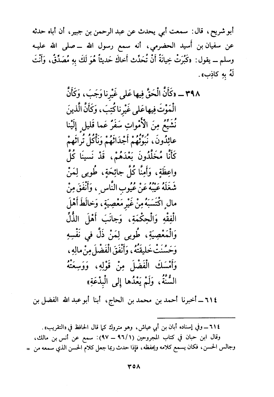 «§كَأَنَّ الْحَقَّ فِيهَا عَلَى غَيْرِنَا وَجَبَ، وَكَأَنَّ الْمَوْتَ فِيهَا عَلَى غَيْرِنَا كُتِبَ، وَكَأَنَّ الَّذِينَ نُشَيِّعُ مِنَ الْأَمْوَاتِ سَفْرٌ عَمَّا قَلِيلٍ إِلَيْنَا عَائِدُونَ، نُبَوِّئُهُمْ أَجْدَاثُهُمْ وَنَأْكُلُ تُرَاثَهُمْ كَأَنَّا مُخَلَّدُونَ بَعْدَهُمْ، قَدْ نَسِينَا كُلَّ وَاعِظَةٍ، وَأَمِنَّا كُلَّ جَائِحَةٍ، طُوبَى لِمَنْ شَغَلَهُ عَيْبُهُ عَنْ عُيُوبِ النَّاسِ، وَأَنْفَقَ مِنْ مَالٍ اكْتَسَبَهُ مِنْ غَيْرِ مَعْصِيَةٍ وَخَالَطَ أَهْلَ الْفِقْهِ الْحِكْمَةِ، وَجَانَبَ أَهْلَ الذُّلِّ وَالْمَعْصِيَةِ، طُوبَى لِمَنْ ذَلَّ فِي نَفْسِهِ وَحَسُنَتْ خَلِيقَتُهُ، وَأَنْفَقَ الْفَضْلَ مِنْ مَالِهِ، وَأَمْسَكَ الْفَضْلَ مِنْ قَوْلِهِ، وَوَسِعَتْهُ السُّنَّةُ وَلَمْ يَعْدُهَا إِلَى الْبِدْعَةِ»