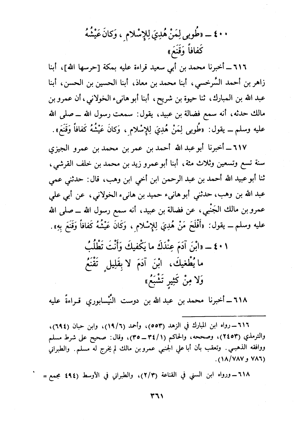 616 - أَخْبَرَنَا مُحَمَّدُ بْنُ أَبِي سَعِيدٍ، قِرَاءَةً عَلَيْهِ بِمَكَّةَ حَرَسَهَا اللَّهُ أبنا زَاهِرُ بْنُ أَحْمَدَ السَّرَخْسِيُّ، أبنا مُحَمَّدُ بْنُ مُعَاذٍ، أبنا الْحُسَيْنُ بْنُ الْحَسَنِ، أبنا عَبْدُ اللَّهِ بْنُ الْمُبَارَكِ، ثنا حَيْوَةُ بْنُ شُرَيْحٍ، أبنا أَبُو هَانِئٍ الْخَوْلَانِيُّ أَنَّ عَمْرَو بْنَ مَالِكٍ حَدَّثَهُ أَنَّهُ، سَمِعَ فَضَالَةَ بْنَ عُبَيْدٍ، يَقُولُ: سَمِعْتُ رَسُولَ اللَّهِ صَلَّى اللهُ عَلَيْهِ وَسَلَّمَ يَقُولُ: §«طُوبَى لِمَنْ هُدِيَ لِلْإِسْلَامِ وَكَانَ عَيْشُهُ كَفَافًا وَقَنَعَ»