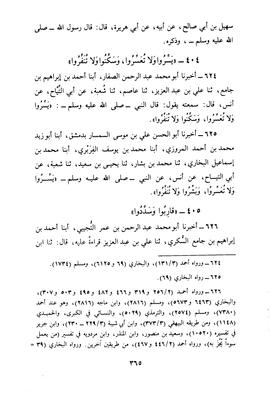 625 - أَخْبَرَنَا أَبُو الْحَسَنِ عَلِيُّ بْنُ مُوسَى السِّمْسَارُ بِدِمَشْقَ، أبنا أَبُو زَيْدٍ مُحَمَّدُ بْنُ أَحْمَدَ الْمَرْوَزِيُّ، أبنا مُحَمَّدُ بْنُ يُوسُفَ الْفَرَبْرِيُّ، أبنا مُحَمَّدُ بْنُ إِسْمَاعِيلَ الْبُخَارِيُّ، ثنا مُحَمَّدُ بْنُ بَشَّارٍ، ثنا يَحْيَى بْنُ سَعِيدٍ، ثنا شُعْبَةُ، عَنْ أَبِي التَّيَّاحِ , عَنْ أَنَسٍ، عَنِ النَّبِيِّ صَلَّى اللهُ عَلَيْهِ وَسَلَّمَ: §«يَسِّرُوا وَلَا تُعَسِّرُوا، وَبَشِّرُوا وَلَا تُنَفِّرُوا»