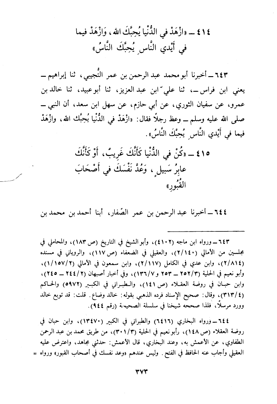 643 - أَخْبَرَنَا أَبُو مُحَمَّدٍ عَبْدُ الرَّحْمَنِ بْنُ عُمَرَ التُّجِيبِيُّ، ثنا إِبْرَاهِيمُ يَعْنِي ابْنَ فِرَاسٍ، ثنا عَلِيُّ بْنُ عَبْدِ الْعَزِيزِ، ثنا أَبُو عُبَيْدٍ، ثنا خَالِدُ بْنُ عَمْرٍو، عَنْ سُفْيَانَ الثَّوْرِيُّ، عَنْ أَبِي حَازِمٍ , عَنْ سَهْلِ بْنِ سَعْدٍ، أَنَّ النَّبِيَّ صَلَّى اللهُ عَلَيْهِ وَسَلَّمَ وَعَظَ رَجُلًا فَقَالَ: «§ازْهَدْ فِي الدُّنْيَا يُحِبُّكَ اللَّهُ، وَازْهَدْ فِيمَا فِي أَيْدِي النَّاسِ يُحِبُّكَ النَّاسُ»