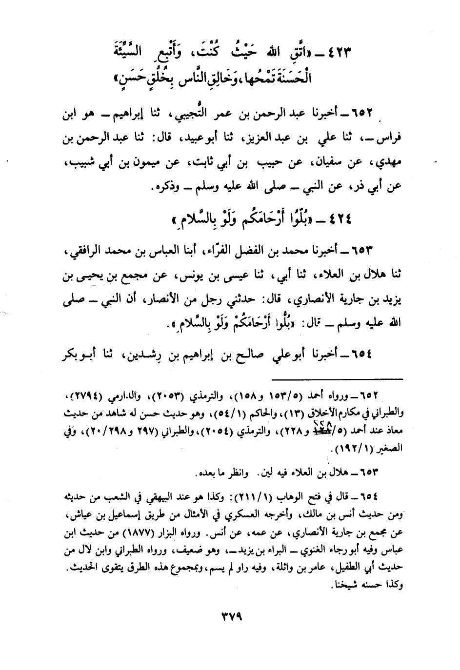 653 - أَخْبَرَنَا مُحَمَّدُ بْنُ الْفَضْلِ الْفَرَّاءُ، أبنا الْعَبَّاسُ بْنُ مُحَمَّدٍ الرَّافِقِيُّ، ثنا هِلَالُ بْنُ الْعَلَاءِ، ثنا أَبِي، ثنا عِيسَى بْنُ يُونُسَ، عَنْ مُجَمِّعِ بْنِ يَحْيَى بْنِ يَزِيدَ بْنِ جَارِيَةَ الْأَنْصَارِيِّ، قَالَ: حَدَّثَنِي رَجُلٌ، مِنَ الْأَنْصَارِ أَنَّ النَّبِيَّ صَلَّى اللهُ عَلَيْهِ وَسَلَّمَ قَالَ: §«بُلُّوا أَرْحَامَكُمْ وَلَوْ بِالسَّلَامِ»