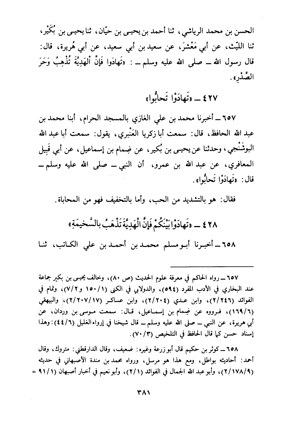 657 - أَخْبَرَنَا مُحَمَّدُ بْنُ عَلِيٍّ الْغَازِيُّ، بِالْمَسْجِدِ الْحَرَامِ، أبنا مُحَمَّدُ بْنُ عَبْدِ اللَّهِ الْحَافِظُ قَالَ: سَمِعْتُ أَبَا زَكَرِيَّا الْعَنْبَرِيَّ، يَقُولُ: سَمِعْتُ أَبَا عَبْدِ اللَّهِ الْبُوشَنْجِيُّ، وَحَدَّثَنَا عَنْ يَحْيَى بْنِ بُكَيْرٍ، عَنْ ضِمَامِ بْنِ إِسْمَاعِيلَ، عَنْ أَبِي قَبِيلٍ الْمَعَافِرِيِّ، عَنْ عَبْدِ اللَّهِ بْنِ عَمْرٍو، أَنَّ النَّبِيَّ صَلَّى اللهُ عَلَيْهِ وَسَلَّمَ قَالَ: «§تَهَادَوْا تَحَابُّوا» فَقَالَ: هُوَ بِالتَّشْدِيدِ مِنَ الْحُبِّ، وَأَمَّا بِالتَّخْفِيفِ فَهُوَ مِنَ الْمُحَابَاةِ