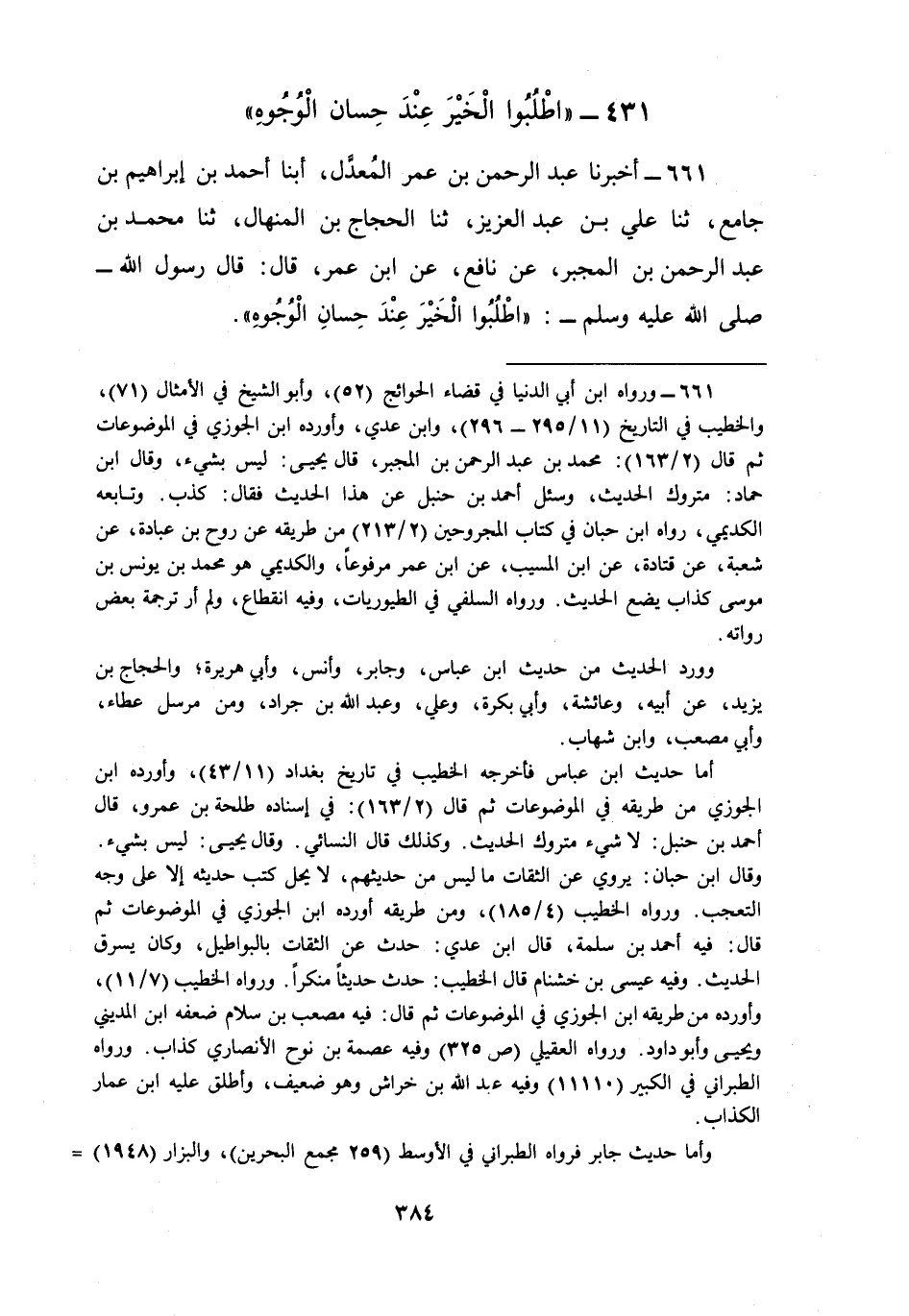 661 - أَخْبَرَنَا عَبْدُ الرَّحْمَنِ بْنُ عُمَرَ الْمُعَدِّلُ، أبنا أَحْمَدُ بْنُ إِبْرَاهِيمَ بْنِ جَامِعٍ، ثنا عَلِيُّ بْنُ عَبْدِ الْعَزِيزِ، ثنا الْحَجَّاجُ بْنُ الْمِنْهَالِ، ثنا مُحَمَّدُ بْنُ عَبْدِ الرَّحْمَنِ بْنِ الْمُجَبِّرِ، عَنْ نَافِعٍ، عَنِ ابْنِ عُمَرَ، قَالَ: قَالَ رَسُولُ اللَّهِ صَلَّى اللهُ عَلَيْهِ وَسَلَّمَ: §«اطْلُبُوا الْخَيْرَ عِنْدَ حِسَانِ الْوُجُوهِ»