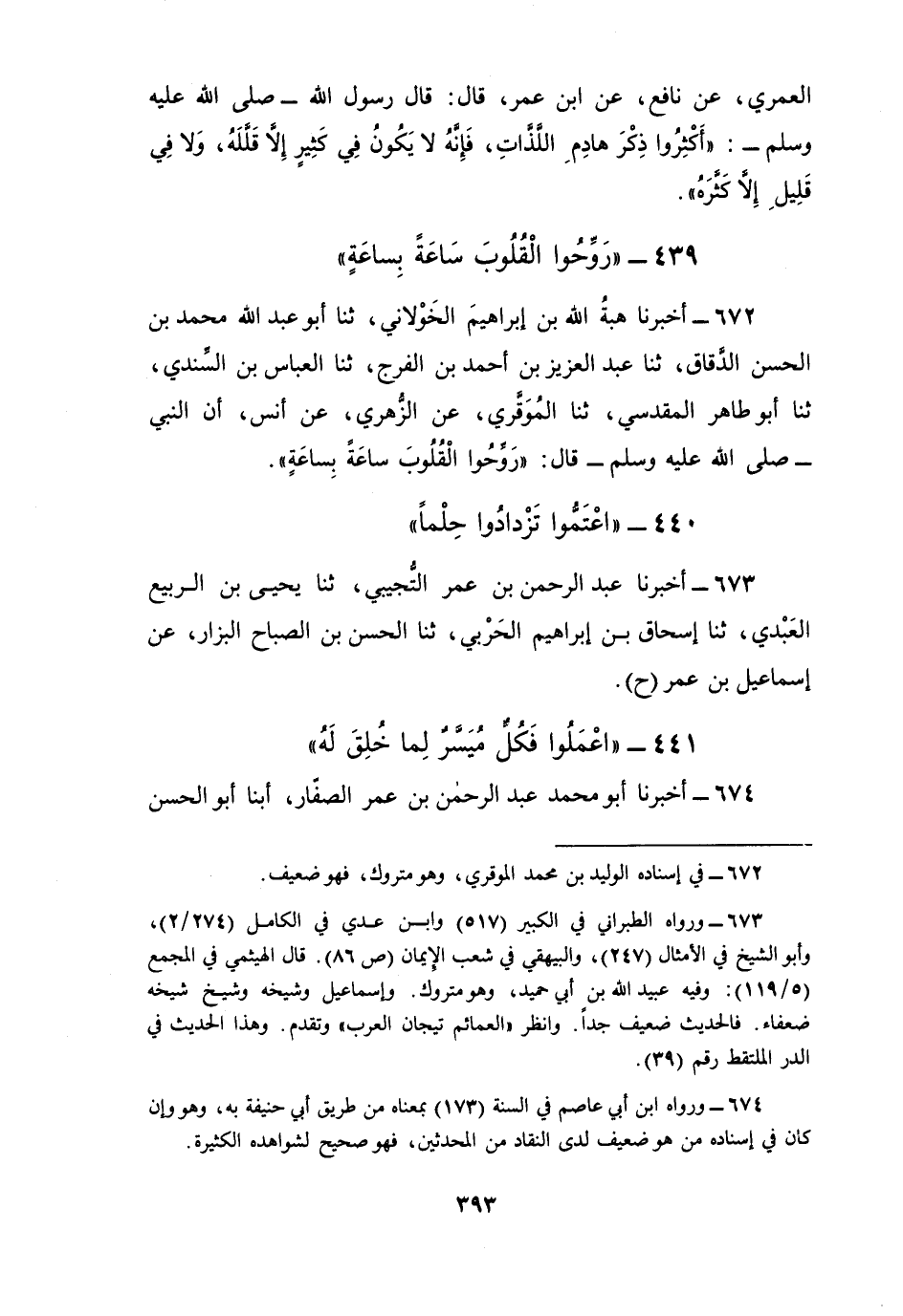 672 - أَخْبَرَنَا هِبَةُ اللَّهِ بْنُ إِبْرَاهِيمَ الْخَوْلَانِيُّ، ثنا أَبُو عَبْدِ اللَّهِ مُحَمَّدُ بْنُ الْحَسَنِ الدَّقَّاقُ، ثنا عَبْدُ الْعَزِيزِ بْنُ أَحْمَدَ بْنِ الْفَرَجِ، ثنا الْعَبَّاسُ بْنُ السِّنْدِيُّ، ثنا أَبُو طَاهِرٍ الْمَقْدِسِيُّ، ثنا الْمُوَقَّرِيُّ، عَنِ الزُّهْرِيِّ، عَنْ أَنَسٍ، أَنَّ النَّبِيَّ صَلَّى اللهُ عَلَيْهِ وَسَلَّمَ قَالَ: §«رَوِّحُوا الْقُلُوبَ سَاعَةً بِسَاعَةٍ»