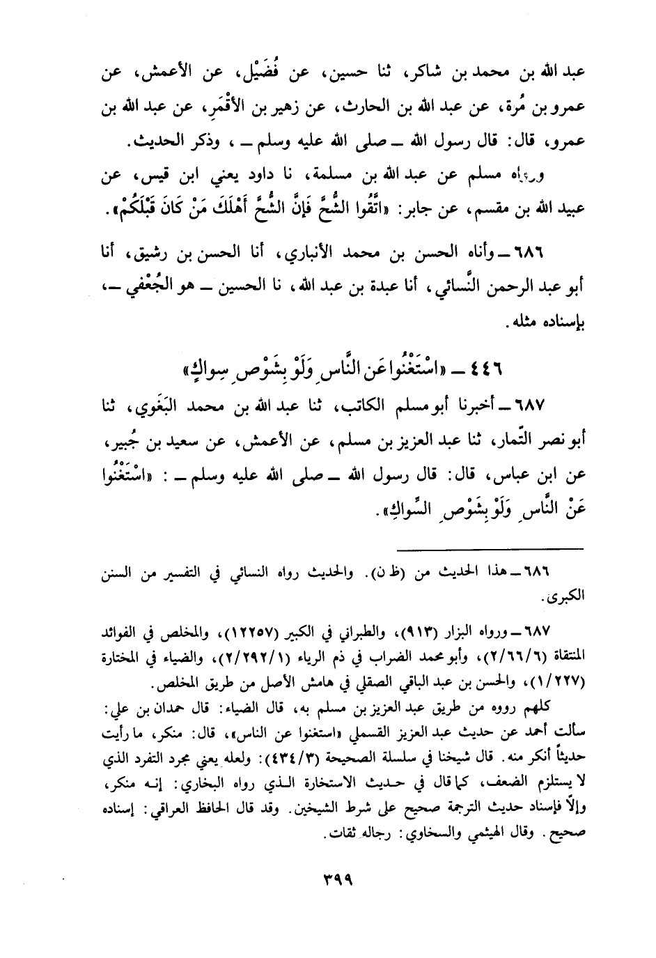 687 - أَخْبَرَنَا أَبُو مُسْلِمٍ الْكَاتِبُ، ثنا عَبْدُ اللَّهِ بْنُ مُحَمَّدٍ الْبَغَوِيُّ، ثنا أَبُو نَصْرٍ التَّمَّارُ، ثنا عَبْدُ الْعَزِيزِ بْنُ مُسْلِمٍ، عَنِ الْأَعْمَشِ، عَنْ سَعِيدِ بْنِ جُبَيْرٍ، عَنِ ابْنِ عَبَّاسٍ، قَالَ: قَالَ رَسُولُ اللَّهِ صَلَّى اللهُ عَلَيْهِ وَسَلَّمَ: §«اسْتَغْنُوا عَنِ النَّاسِ وَلَوْ بِشَوْصِ سِوَاكٍ»