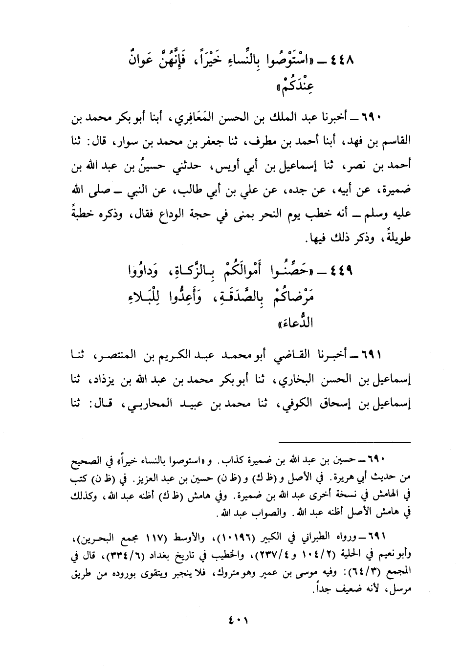 691 - أَخْبَرَنَا الْقَاضِي أَبُو مُحَمَّدٍ عَبْدُ الْكَرِيمِ بْنُ الْمُنْتَصِرِ، ثنا إِسْمَاعِيلُ بْنُ الْحَسَنِ الْبُخَارِيُّ، ثنا أَبُو بَكْرٍ مُحَمَّدُ بْنُ عَبْدِ اللَّهِ بْنِ يَزْذَادَ، ثنا إِسْمَاعِيلُ بْنُ إِسْحَاقَ الْكُوفِيُّ، ثنا مُحَمَّدُ بْنُ عُبَيْدٍ الْمُحَارِبِيُّ، قَالَ: ثنا مُوسَى بْنُ عُمَيْرٍ، عَنِ الْحَكَمِ، عَنْ إِبْرَاهِيمَ، عَنِ الْأَسْوَدِ، عَنِ ابْنِ مَسْعُودٍ، قَالَ: قَالَ رَسُولُ اللَّهِ صَلَّى اللهُ عَلَيْهِ وَسَلَّمَ. وَذَكَرَهُ