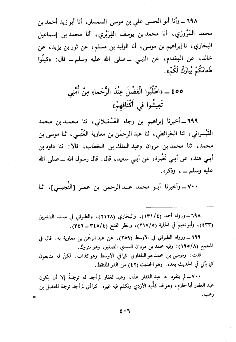 700 - وَأَخْبَرَنَا أَبُو مُحَمَّدٍ عَبْدُ الرَّحْمَنِ بْنُ عُمَرَ التُّجِيبِيُّ، ثنا الْفَضْلُ بْنُ رهبٍ، ثنا الرَّبِيعُ بْنُ سُلَيْمَانَ، ثنا عَبْدُ الْغَفَّارِ بْنُ الْحَسَنِ بْنِ دِينَارٍ، عَنْ دَاوُدَ بْنِ أَبِي هِنْدَ، عَنْ أَبِي نَضْرَةَ , عَنْ أَبِي سَعِيدٍ، قَالَ: قَالَ رَسُولُ اللَّهِ صَلَّى اللهُ عَلَيْهِ وَسَلَّمَ: " يَقُولُ اللَّهُ: §اطْلُبُوا الْفَضْلَ عِنْدَ الرُّحَمَاءِ مِنْ عِبَادِي تَعِيشُوا فِي أَكْنَافِهِمْ فَإِنَّ فِيهِمْ رَحْمَتِي، وَلَا تَطْلُبُوهَا مِنَ الْقَاسِيَةِ قُلُوبُهُمْ فَإِنَّ فِيهِمْ سُخْطِي " تَفَرَّدَ بِهِ عَبْدُ الْغَفَّارِ بْنُ الْحَسَنِ بْنِ دِينَارٍ وَهُوَ غَرِيبٌ