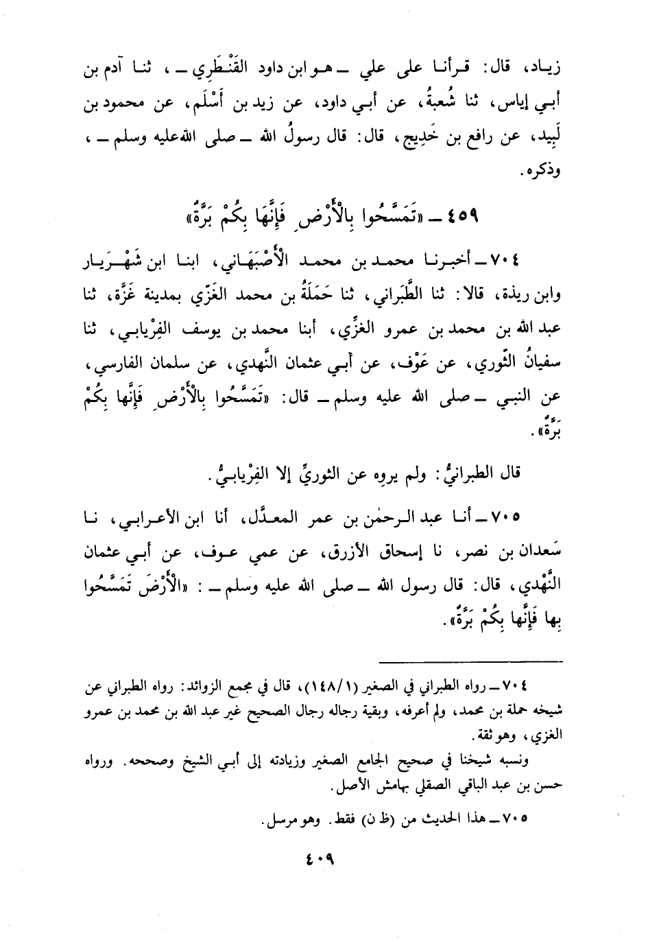 704 - أَخْبَرَنَا مُحَمَّدُ بْنُ مُحَمَّدٍ الْأَصْبَهَانِيُّ، أبنا ابْنُ شَهْرَيَارَ وَابْنُ رِيذَةَ قَالَا: ثنا الطَّبَرَانِيُّ، ثنا حَمَلَةُ بْنُ مُحَمَّدٍ الْغَزِّيُّ، بِمَدِينَةِ غَزَّةَ، ثنا عَبْدُ اللَّهِ بْنُ مُحَمَّدِ بْنِ عَمْرٍو الْغَزِّيُّ، أبنا مُحَمَّدُ بْنُ يُوسُفَ الْفِرْيَابِيُّ، ثنا سُفْيَانُ الثَّوْرِيُّ، عَنْ عَوْفٍ، عَنْ أَبِي عُثْمَانَ النَّهْدِيِّ , عَنْ سَلْمَانَ الْفَارِسِيِّ، عَنِ النَّبِيِّ صَلَّى اللهُ عَلَيْهِ وَسَلَّمَ قَالَ: «§تَمَسَّحُوا بِالْأَرْضِ فَإِنَّهَا بِكُمْ بَرَّةٌ» قَالَ الطَّبَرَانِيُّ: وَلَمْ يَرْوِهِ عَنِ الثَّوْرِيِّ إِلَّا الْفِرْيَابِيُّ