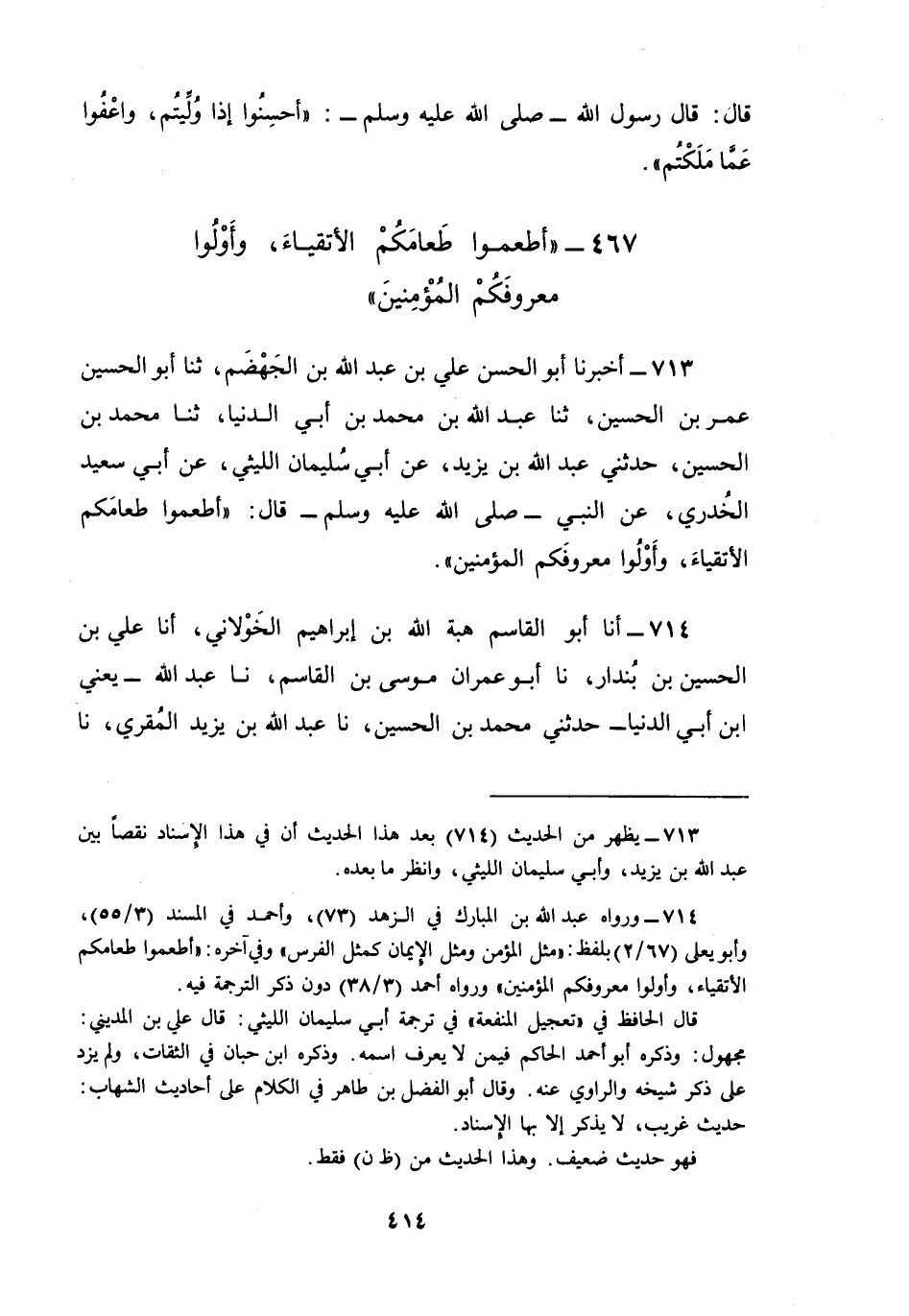 713 - أَخْبَرَنَا أَبُو الْحَسَنِ عَلِيُّ بْنُ عَبْدِ اللَّهِ بْنِ الْجَهْضَمِ، ثنا أَبُو الْحُسَيْنِ عُمَرُ بْنُ الْحُسَيْنِ، ثنا عَبْدُ اللَّهِ بْنُ مُحَمَّدِ بْنِ أَبِي الدُّنْيَا، ثنا مُحَمَّدُ بْنُ الْحُسَيْنِ، حَدَّثَنِي عَبْدُ اللَّهِ بْنُ يَزِيدَ، عَنْ أَبِي سُلَيْمَانَ اللَّيْثِيِّ , عَنْ أَبِي سَعِيدٍ الْخُدْرِيِّ، عَنِ النَّبِيِّ صَلَّى اللهُ عَلَيْهِ وَسَلَّمَ قَالَ: «§أَطْعِمُوا طَعَامَكُمُ الْأَتْقِيَاءَ، وَأُولُوا مَعْرُوفَكُمُ الْمُؤْمِنِينَ»