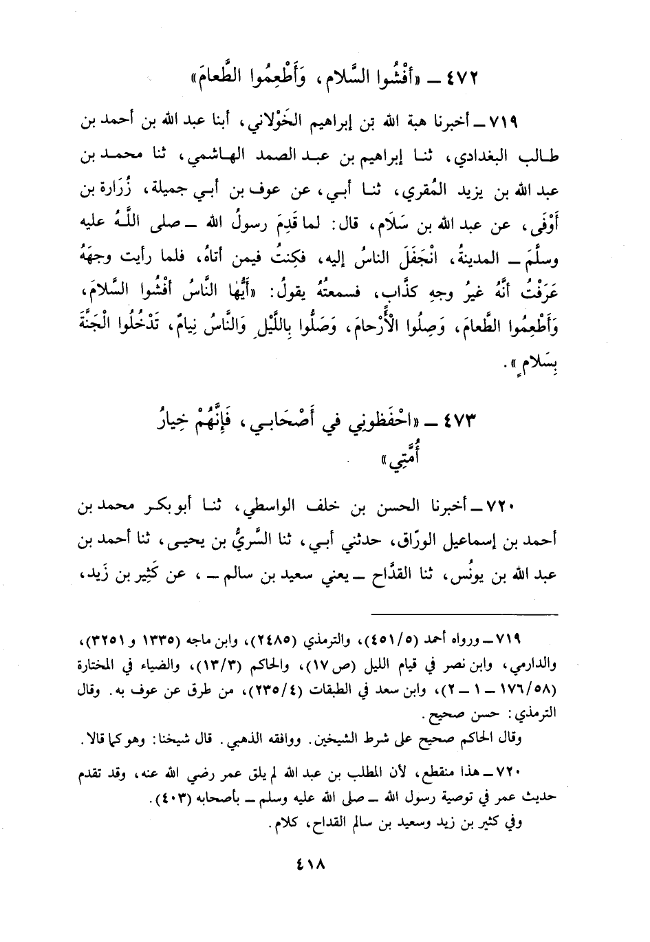 719 - أَخْبَرَنَا هِبَةُ اللَّهِ بْنُ إِبْرَاهِيمَ الْخَوْلَانِيُّ، أبنا عَبْدُ اللَّهِ بْنُ أَحْمَدَ بْنِ طَالِبٍ الْبَغْدَادِيُّ، ثنا إِبْرَاهِيمُ بْنُ عَبْدِ الصَّمَدِ الْهَاشِمِيُّ، ثنا مُحَمَّدُ بْنُ عَبْدِ اللَّهِ بْنِ يَزِيدَ الْمُقْرِئُ، ثنا أَبِي، عَنْ عَوْفِ بْنِ أَبِي جَمِيلَةَ أَوْ زُرَارَةَ بْنِ أَوْفَى، عَنْ عَبْدِ اللَّهِ بْنِ سَلَّامٍ، قَالَ: لَمَّا قَدِمَ رَسُولُ اللَّهِ صَلَّى اللهُ عَلَيْهِ وَسَلَّمَ الْمَدِينَةَ انْجَفَلَ النَّاسُ إِلَيْهِ فَكُنْتُ فِيمَنْ أَتَاهُ، فَلَمَّا رَأَيْتُ وَجْهَهُ عَرَفْتُ أَنَّهُ غَيْرَ وَجْهِ كَذَّابٍ فَسَمِعْتُهُ يَقُولُ: " أَيُّهَا النَّاسُ: §أَفْشُوا السَّلَامَ، وَأَطْعِمُوا الطَّعَامَ، وَصِلُوا الْأَرْحَامَ، وَصَلُّوا بِاللَّيْلِ وَالنَّاسُ نِيَامٌ تَدْخُلُوا الْجَنَّةَ بِسَلَامٍ "