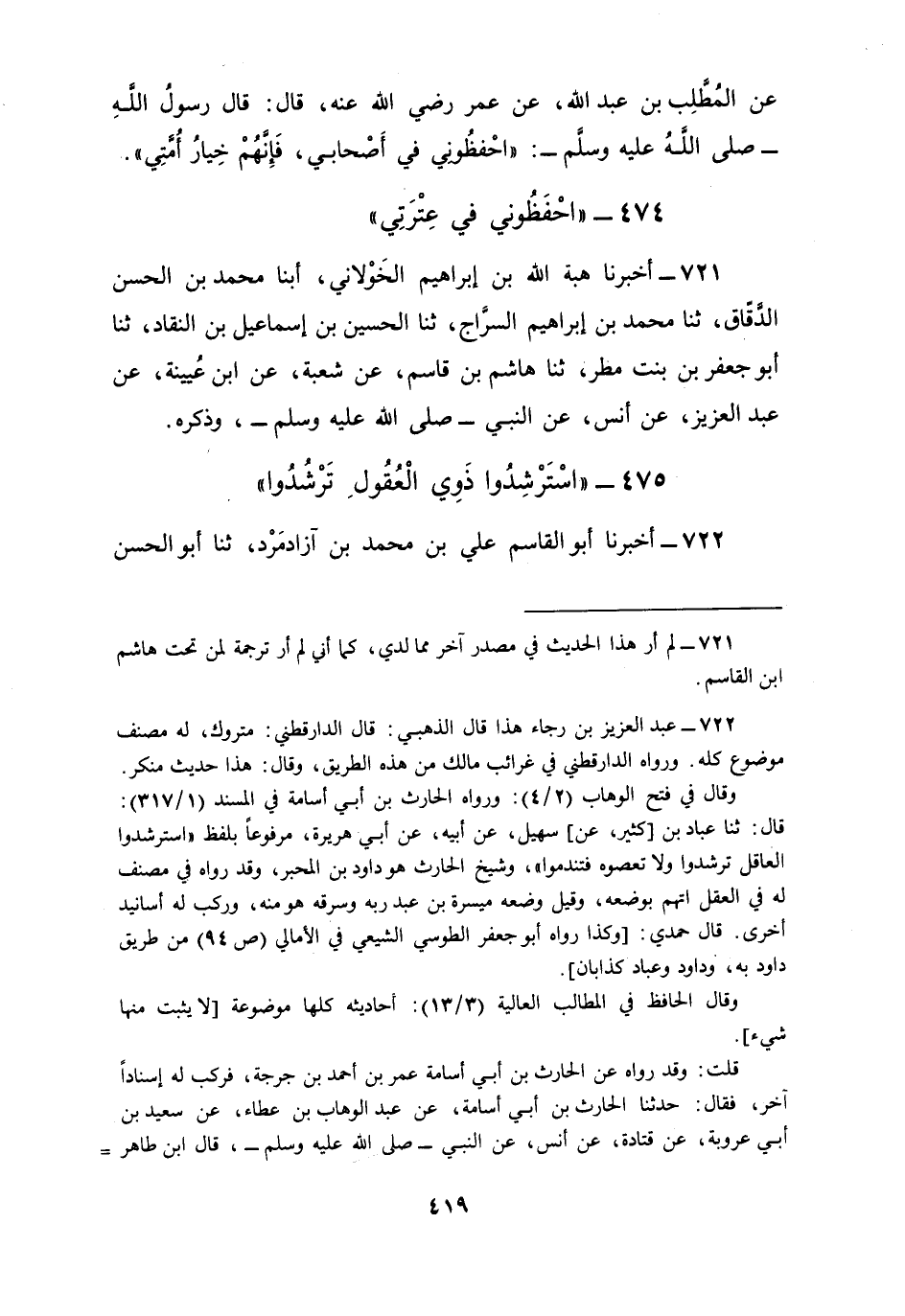 721 - أَخْبَرَنَا هِبَةُ اللَّهِ بْنُ إِبْرَاهِيمَ الْخَوْلَانِيُّ، أبنا مُحَمَّدُ بْنُ الْحَسَنِ الدَّقَّاقُ، ثنا مُحَمَّدُ بْنُ إِبْرَاهِيمَ السَّرَّاجُ، ثنا الْحُسَيْنُ بْنُ إِسْمَاعِيلَ بْنِ النَّقَّادِ، ثنا أَبُو جَعْفَرِ بْنُ بِنْتِ مَطَرٍ، ثنا هَاشِمُ بْنُ قَاسِمٍ، عَنْ شُعْبَةَ، عَنِ ابْنِ عُيَيْنَةَ، عَنْ عَبْدِ الْعَزِيزِ , عَنْ أَنَسٍ، عَنِ النَّبِيِّ صَلَّى اللهُ عَلَيْهِ وَسَلَّمَ، وَذَكَرَهُ