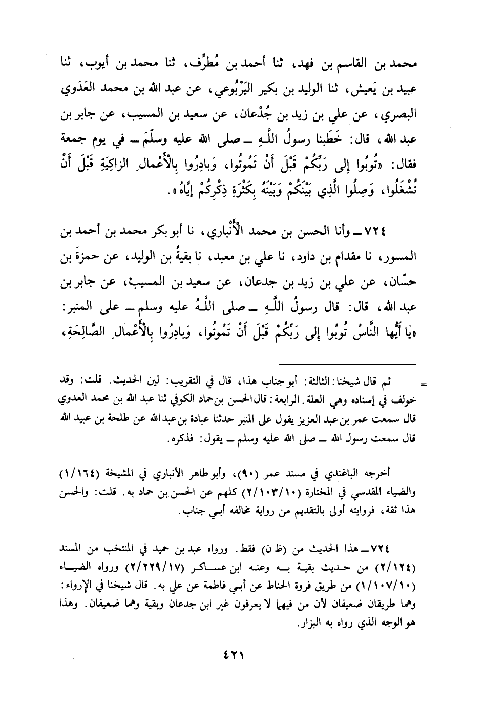 724 - وأنا الْحَسَنُ بْنُ مُحَمَّدٍ الْأَنْبَارِيُّ، نا أَبُو بَكْرٍ، مُحَمَّدُ بْنُ أَحْمَدَ بْنِ الْمِسْوَرِ نا مِقْدَامُ بْنُ دَاوُدَ، نا عَلِيُّ بْنُ مَعْبَدٍ، نا بَقِيَّةُ بْنُ الْوَلِيدِ، عَنْ حَمْزَةَ بْنِ حَسَّانَ، عَنْ عَلِيِّ بْنِ زَيْدِ بْنِ جُدْعَانَ، عَنْ سَعِيدِ بْنِ الْمُسَيِّبِ , عَنْ جَابِرِ بْنِ عَبْدِ اللَّهِ، قَالَ: قَالَ رَسُولُ اللَّهِ صَلَّى اللهُ عَلَيْهِ وَسَلَّمَ عَلَى الْمِنْبَرِ: «§يَا أَيُّهَا النَّاسُ تُوبُوا إِلَى رَبِّكُمْ قَبْلَ أَنْ تَمُوتُوا، وَبَادِرُوا بِالْأَعْمَالِ الصَّالِحَةِ قَبْلَ أَنْ تُشْغَلُوا، وَصِلُوا الَّذِي بَيْنَكُمْ وَبَيْنَهُ بِكَثْرَةِ ذِكْرِكُمْ لَهُ وَبِكَثْرَةِ الصَّدَقَةِ فِي السِّرِّ وَالْعَلَانِيَةِ تُنْصَرُوا وَتُؤْجَرُوا وَتُرْزَقُوا» مُخْتَصَرٌ