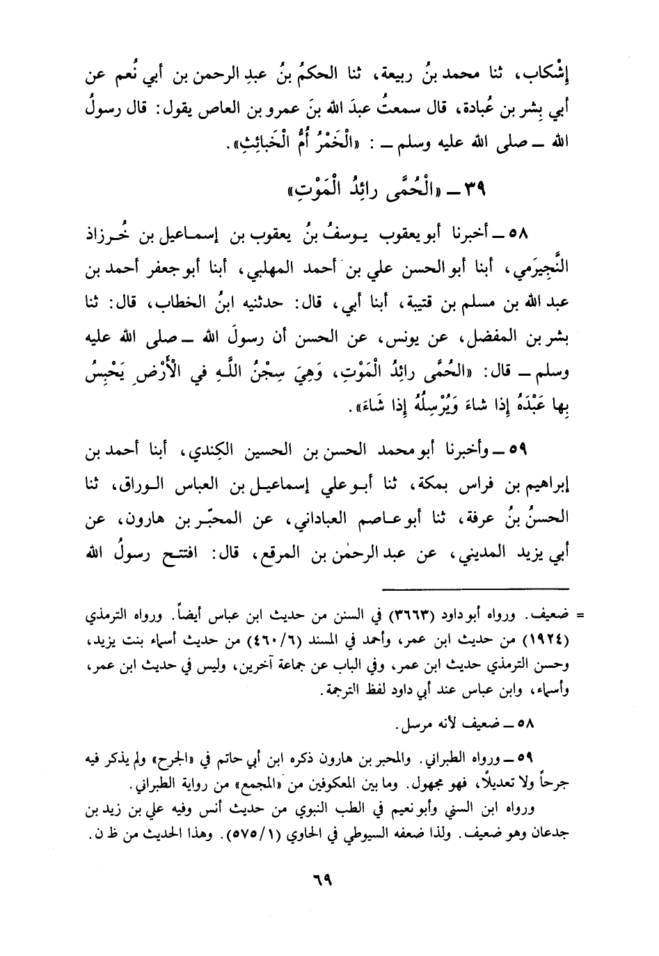 59 - وَأَخْبَرَنَا أَبُو مُحَمَّدٍ الْحَسَنُ بْنُ الْحُسَيْنِ الْكِنْدِيُّ، أبنا أَحْمَدُ بْنُ إِبْرَاهِيمَ بْنِ فِرَاسٍ بِمَكَّةَ، ثنا أَبُو عَلِيُّ إِسْمَاعِيلُ بْنُ الْعَبَّاسِ الْوَرَّاقُ، ثنا الْحَسَنُ بْنُ عَرَفَهُ، ثنا أَبُو عَاصِمٍ الْعَبَّادَانِيُّ، عَنِ الْمُحَبَّرِ بْنِ هَارُونَ، عَنْ أَبِي يَزِيدَ الْمَدِينِيِّ، عَنْ عَبْدِ الرَّحْمَنِ بْنِ الْمُرَقِّعِ، قَالَ: افْتَتَحَ رَسُولُ اللَّهِ صَلَّى اللهُ عَلَيْهِ وَسَلَّمَ خَيْبَرَ وَهُوَ فِي أَلْفٍ وَثَمَانِمِائَةٍ فَقَسَمَ عَلَى ثَمَانِيَةَ عَشَرَ سَهْمًا، لِكُلِّ مِائَةٍ سَهْمٌ قَالَ: وَهِيَ مَخْضَرَّةٌ مِنَ الْفَوَاكِهِ فَأَكَلُوا فَمَعَكَتْهُمُ الْحُمَّى فَشَكَوْهَا إِلَى رَسُولِ اللَّهِ صَلَّى اللهُ عَلَيْهِ وَسَلَّمَ فَقَالَ: «يَا أَيُّهَا النَّاسُ إِنَّ §الْحُمَّى رَائِدُ الْمَوْتِ وَسِجْنُ اللَّهِ فِي الْأَرْضِ» مُخْتَصَرٌ