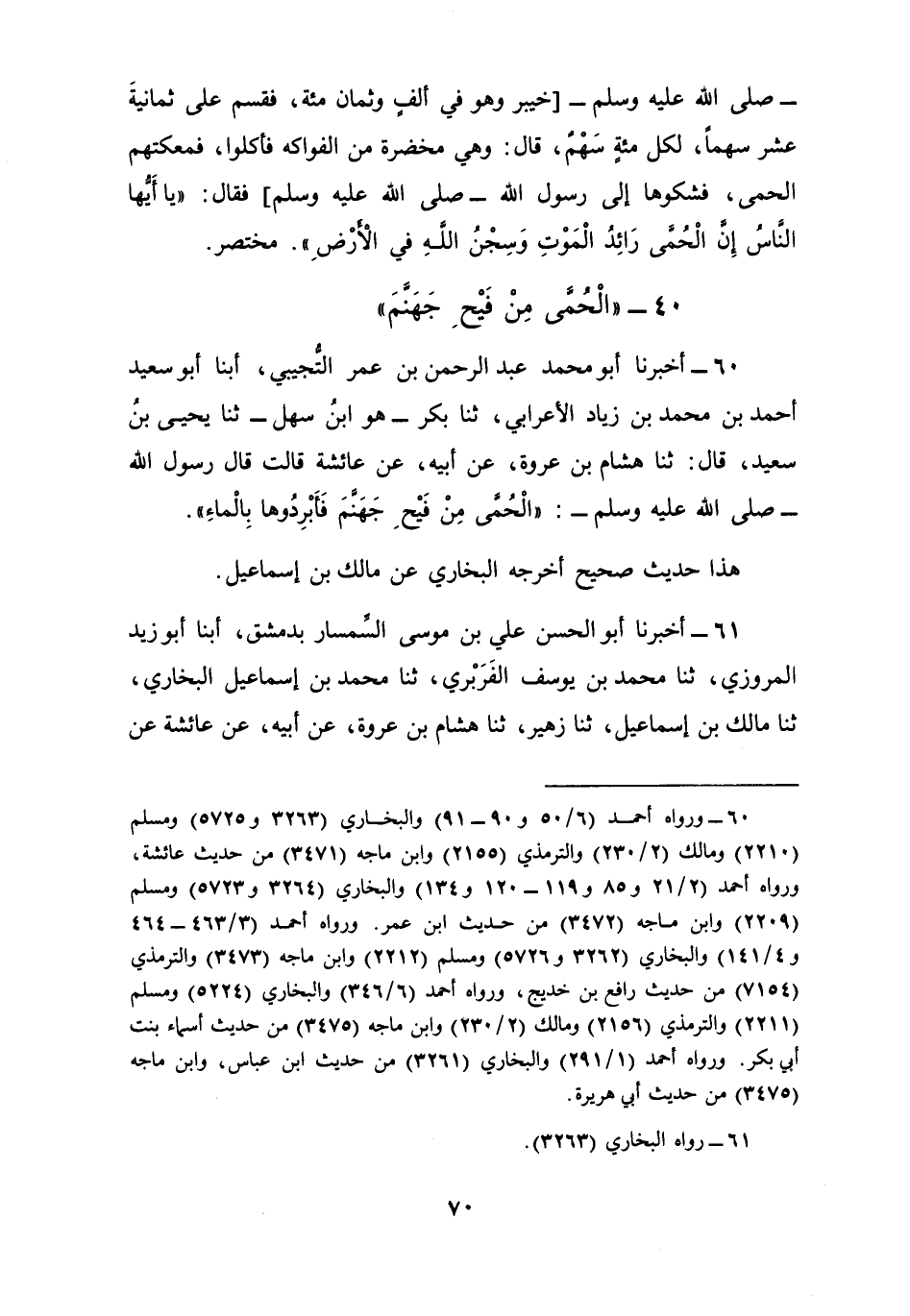 61 - أَخْبَرَنَا أَبُو الْحَسَنِ عَلِيُّ بْنُ مُوسَى السِّمْسَارُ بِدِمَشْقَ، أبنا أَبُو زَيْدٍ الْمَرْوَزِيُّ، ثنا مُحَمَّدُ بْنُ يُوسُفَ الْفَرَبْرِيُّ، ثنا مُحَمَّدُ بْنُ إِسْمَاعِيلَ الْبُخَارِيُّ، ثنا مَالِكُ بْنُ إِسْمَاعِيلَ، ثنا زُهَيْرٌ، ثنا هِشَامُ بْنُ عُرْوَةَ، عَنْ أَبِيهِ، عَنْ عَائِشَةَ، عَنِ النَّبِيِّ صَلَّى اللهُ عَلَيْهِ وَسَلَّمَ قَالَ: «§الْحُمَّى مِنْ فَيْحِ جَهَنَّمَ فَأَبْرِدُوهَا بِالْمَاءِ»