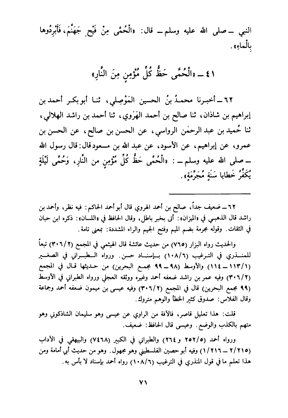 62 - أَخْبَرَنَا مُحَمَّدُ بْنُ الْحُسَيْنِ الْمَوْصِلِيُّ، ثنا أَبُو بَكْرٍ أَحْمَدُ بْنُ إِبْرَاهِيمَ بْنِ شَاذَانَ، ثنا صَالِحُ بْنُ أَحْمَدَ الْهَرَوِيُّ، ثنا أَحْمَدُ بْنُ رَاشِدٍ الْهِلَالِيُّ، ثنا حُمَيْدُ بْنُ عَبْدِ الرَّحْمَنِ الرُّوَاسِيُّ، عَنِ الْحَسَنِ بْنِ صَالِحٍ، عَنِ الْحَسَنِ بْنِ عَمْرٍو، عَنْ إِبْرَاهِيمَ، عَنِ الْأَسْوَدِ، عَنْ عَبْدِ اللَّهِ بْنِ مَسْعُودٍ، قَالَ: قَالَ رَسُولُ اللَّهِ صَلَّى اللهُ عَلَيْهِ وَسَلَّمَ: «§الْحُمَّى حَظُّ كُلِّ مُؤْمِنٍ مِنَ النَّارِ، وَحَمَى لَيْلَةٍ يُكَفِّرُ خَطَايَا سَنَةٍ مَجَرَّمَةٍ»