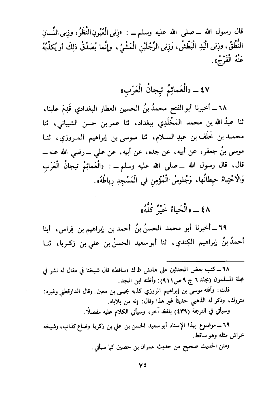 68 - أَخْبَرَنَا أَبُو الْفَتْحِ مُحَمَّدُ بْنُ الْحُسَيْنِ الْعَطَّارُ الْبَغْدَادِيُّ قَدِمَ عَلَيْنَا، ثنا عَبْدُ اللَّهِ بْنُ مُحَمَّدٍ الْمَخْلَدِيُّ، بِبَغْدَادَ، ثنا عُمَرُ بْنُ حَسَنٍ الشَّيْبَانِيُّ، ثنا مُحَمَّدُ بْنُ خَلَفِ بْنِ عَبْدِ السَّلَامِ، ثنا مُوسَى بْنُ إِبْرَاهِيمَ الْمَرْوَزِيُّ، ثنا مُوسَى بْنُ جَعْفَرٍ، عَنْ أَبِيهِ، عَنْ جَدِّهِ، عَنْ أَبِيهِ، عَنْ عَلِيٍّ رَضِيَ اللَّهُ عَنْهُ قَالَ: قَالَ رَسُولُ اللَّهِ صَلَّى اللهُ عَلَيْهِ وَسَلَّمَ: «§الْعَمَائِمُ تِيجَانُ الْعَرَبِ، وَالِاحْتِبَاءُ حِيطَانُهَا، وَجُلُوسُ الْمُؤْمِنِ فِي الْمَسْجِدِ رِبَاطُهُ»