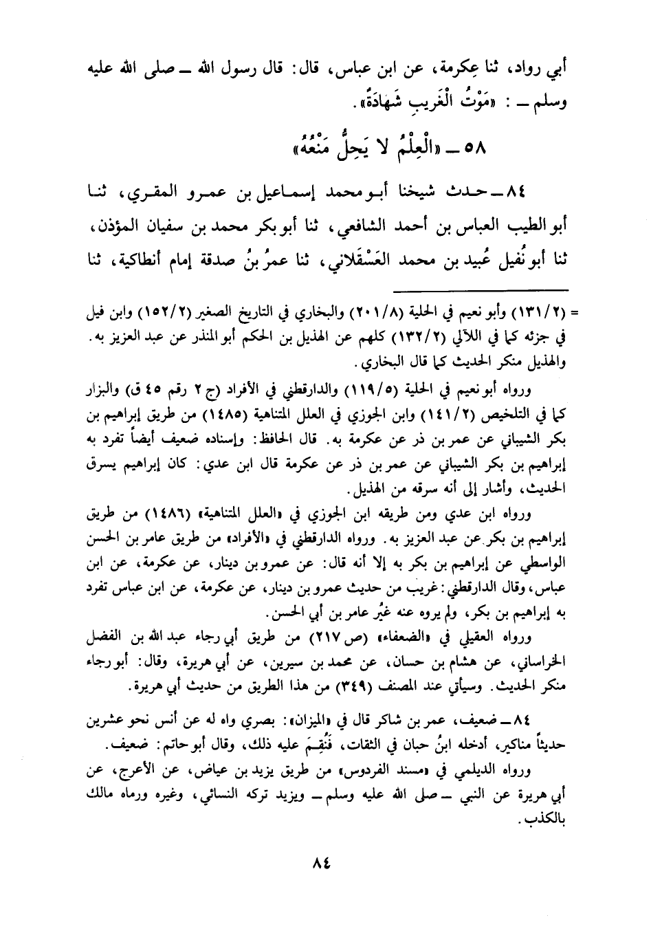 84 - حَدَّثَ شَيْخِنَا أَبُو مُحَمَّدٍ إِسْمَاعِيلُ بْنُ عَمْرٍو الْمُقْرِئُ، ثنا أَبُو الطَّيِّبِ الْعَبَّاسُ بْنُ أَحْمَدَ الشَّافِعِيُّ، ثنا أَبُو بَكْرٍ مُحَمَّدُ بْنُ سُفْيَانَ الْمُؤَذِّنُ، ثنا أَبُو نُفَيْلٍ عُبَيْدُ بْنُ مُحَمَّدٍ الْعَسْقَلَانِيُّ، ثنا عُمَرُ بْنُ صَدَقَةَ، إِمَامُ أَنْطَاكِيَةَ، ثنا عُمَرُ بْنُ شَاكِرٍ، عَنْ أَنَسٍ، قَالَ: قَالَ رَسُولُ اللَّهِ صَلَّى اللهُ عَلَيْهِ وَسَلَّمَ: " §أَيُّ شَيْءٍ لَا يَحِلُّ مَنَعُهُ؟، فَقَالَ بَعْضُهُمُ: الْمِلْحُ، وَقَالَ آخَرُ: النَّارُ، فَلَمَّا أَعْيَاهُمْ قَالُوا: اللَّهُ وَرَسُولُهُ أَعْلَمُ، قَالَ: «ذَلِكَ الْعِلْمُ لَا يَحِلُّ مَنَعُهُ»