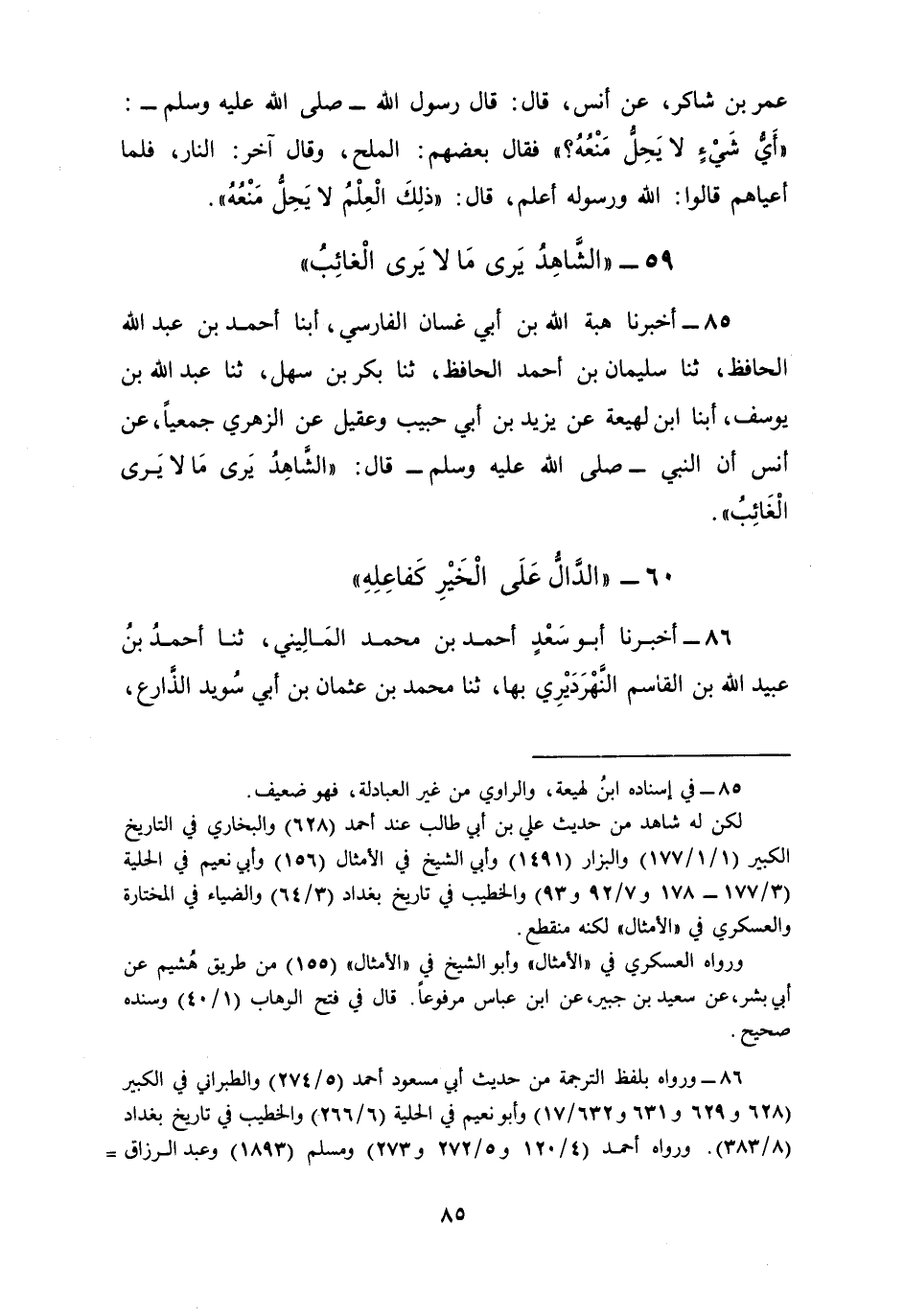 85 - أَخْبَرَنَا هِبَةُ اللَّهِ بْنُ أَبِي غَسَّانَ الْفَارِسِيُّ، أبنا أَحْمَدُ بْنُ عَبْدِ اللَّهِ الْحَافِظُ، ثنا سُلَيْمَانُ بْنُ أَحْمَدَ الْحَافِظُ، ثنا بَكْرُ بْنُ سَهْلٍ، ثنا عَبْدُ اللَّهِ بْنُ يُوسُفَ، أبنا ابْنُ لَهِيعَةَ عَنْ يَزِيدَ بْنِ أَبِي حَبِيبٍ وَعُقَيْلٍ، عَنِ الزُّهْرِيِّ جَمِيعًا عَنْ أَنَسٍ، أَنَّ النَّبِيَّ صَلَّى اللهُ عَلَيْهِ وَسَلَّمَ قَالَ: §«الشَّاهِدُ يَرَى مَا لَا يَرَى الْغَائِبُ»