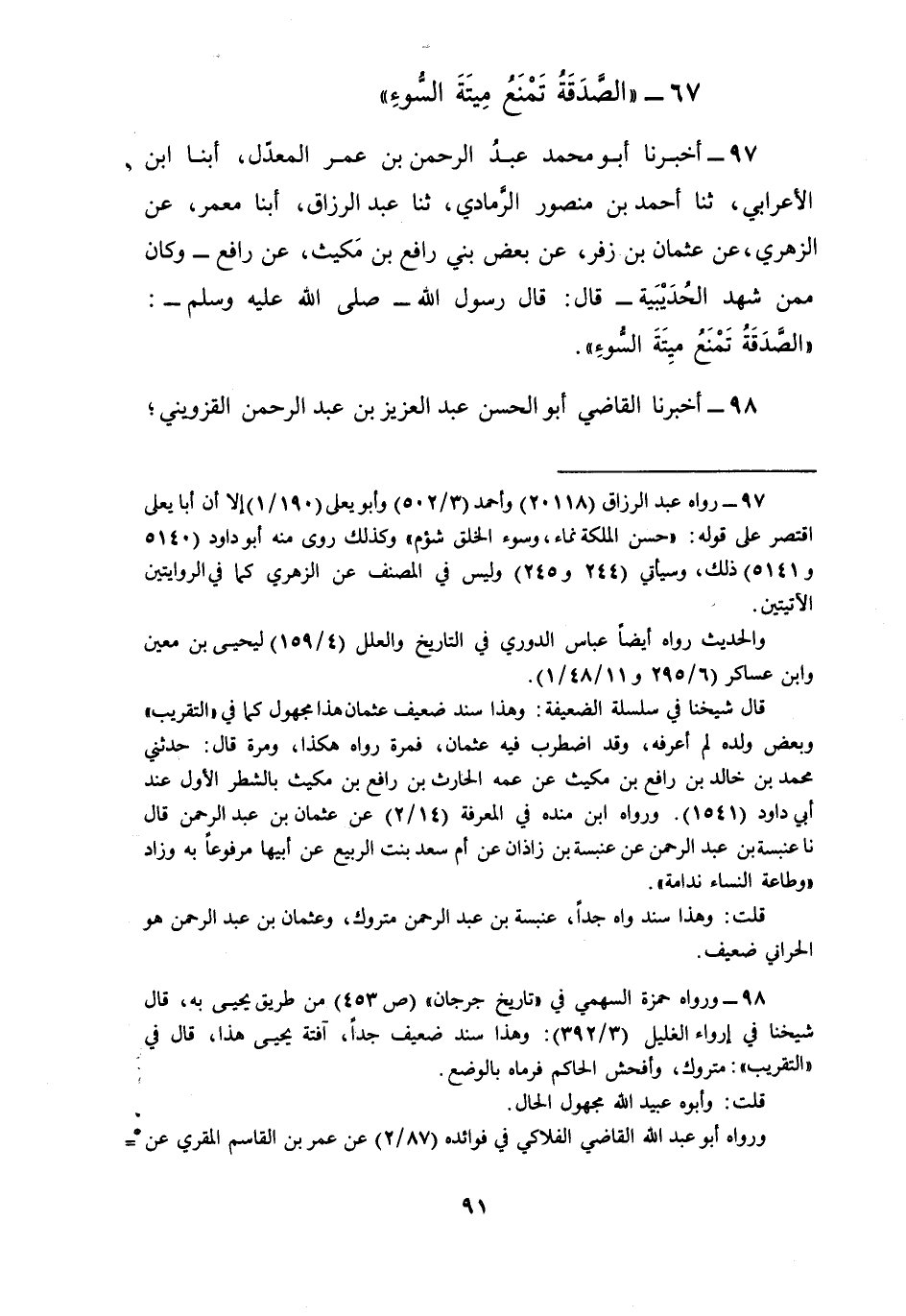 97 - أَخْبَرَنَا أَبُو مُحَمَّدٍ عَبْدُ الرَّحْمَنِ بْنُ عُمَرَ الْمُعَدِّلُ، أبنا ابْنُ الْأَعْرَابِيِّ ثنا أَحْمَدُ بْنُ مَنْصُورٍ الرَّمَادِيُّ، ثنا عَبْدُ الرَّزَّاقِ، أبنا مَعْمَرٌ، عَنِ الزُّهْرِيِّ، عَنْ عُثْمَانَ بْنِ زُفَرٍ، عَنْ بَعْضِ بَنِي رَافِعِ بْنِ مَكِيثٍ، عَنْ رَافِعٍ وَكَانَ، مِمَّنْ شَهِدَ الْحُدَيْبِيَةَ قَالَ: قَالَ رَسُولُ اللَّهِ صَلَّى اللهُ عَلَيْهِ وَسَلَّمَ: §«الصَّدَقَةُ تَمْنَعُ مِيتَةَ السُّوءِ»
