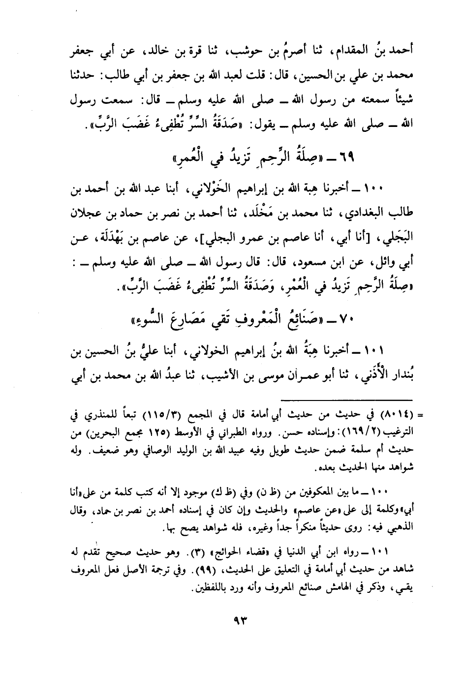 100 - أَخْبَرَنَا هِبَةُ اللَّهِ بْنُ إِبْرَاهِيمَ الْخَوْلَانِيُّ، أبنا عَبْدُ اللَّهِ بْنُ أَحْمَدَ بْنِ طَالِبٍ الْبَغْدَادِيُّ، ثنا مُحَمَّدُ بْنُ مَخْلَدٍ، ثنا أَحْمَدُ بْنُ نَصْرِ بْنِ حَمَّادِ بْنِ عَجْلَانَ الْبَجَلِيُّ، أنا أَبِي، أنا عَاصِمُ بْنُ عَمْرٍو الْبَجَلِيُّ، عَنْ عَاصِمِ ابْنِ بَهْدَلَةَ، عَنْ أَبِي وَائِلٍ، عَنِ ابْنِ مَسْعُودٍ، قَالَ: قَالَ رَسُولُ اللَّهِ صَلَّى اللهُ عَلَيْهِ وَسَلَّمَ: «§صِلَةُ الرَّحِمِ تَزِيدُ فِي الْعُمُرِ، وَصَدَقَةُ السِّرِّ تُطْفِئُ غَضَبَ الرَّبِّ»