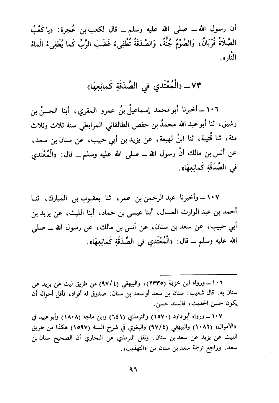 106 - أَخْبَرَنَا أَبُو مُحَمَّدٍ إِسْمَاعِيلُ بْنُ عَمْرٍو الْمُقْرِئُ، أبنا الْحَسَنُ بْنُ رَشِيقٍ، ثنا أَبُو عَبْدِ اللَّهِ مُحَمَّدُ بْنُ حَفْصٍ الطَّالْقَانِيُّ الْمُرَابِطِيُّ سَنَةَ ثَلَاثٍ وَثَلَاثِ مِائَةٍ، ثنا قُتَيْبَةُ، ثنا ابْنُ لَهِيعَةَ، عَنْ يَزِيدَ بْنِ أَبِي حَبِيبٍ، عَنْ سِنَانِ بْنِ سَعْدٍ، عَنْ أَنَسِ بْنِ مَالِكٍ أَنَّ رَسُولَ اللَّهِ صَلَّى اللهُ عَلَيْهِ وَسَلَّمَ قَالَ: §«الْمُعْتَدِي فِي الصَّدَقَةِ كَمَانِعِهَا»