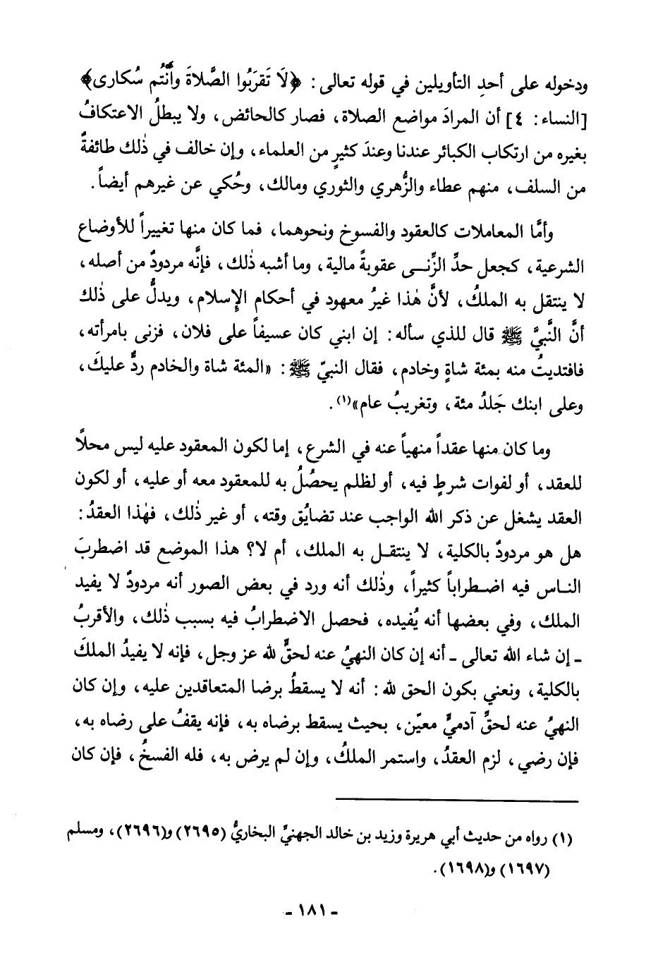 وَدُخُولِهِ عَلَى أَحَدِ التَّأْوِيلَيْنِ فِي قَوْلِهِ تَعَالَى: {لَا تَقْرَبُوا الصَّلَاةَ وَأَنْتُمْ سُكَارَى} [النساء: 43] (النِّسَاءِ: 43) أَنَّ الْمُرَادَ مَوَاضِعُ الصَّلَاةِ، فَصَارَ كَالْحَائِضِ، وَلَا يُبْطِلُ الِاعْتِكَافَ بِغَيْرِهِ مِنِ ارْتِكَابِهِ الْكَبَائِرَ عِنْدَنَا وَعِنْدَ كَثِيرٍ مِنَ الْعُلَمَاءِ، وَإِنْ خَالَفَ فِي ذَلِكَ طَائِفَةٌ مِنَ السَّلَفِ، مِنْهُمْ عَطَاءٌ وَالزُّهْرِيُّ وَالثَّوْرِيُّ وَمَالِكٌ، وَحُكِيَ عَنْ غَيْرِهِمْ أَيْضًا. وَأَمَّا الْمُعَامَلَاتُ كَالْعُقُودِ وَالْفُسُوخِ وَنَحْوِهِمَا، فَمَا كَانَ مِنْهَا تَغَيُّرًا لِلْأَوْضَاعِ الشَّرْعِيَّةِ، كَجَعْلِ حَدِّ الزِّنَا عُقُوبَةً مَالِيَّةً، وَمَا أَشْبَهَ ذَلِكَ، فَإِنَّهُ مَرْدُودٌ مِنْ أَصْلِهِ، لَا يَنْتَقِلُ بِهِ الْمِلْكُ، لِأَنَّ هَذَا غَيْرُ مَعْهُودٍ فِي أَحْكَامِ الْإِسْلَامِ، وَيَدُلُّ عَلَى ذَلِكَ أَنَّ «النَّبِيَّ صَلَّى اللَّهُ عَلَيْهِ وَسَلَّمَ قَالَ لِلَّذِي سَأَلَهُ: إِنَّ ابْنِي كَانَ عَسِيفًا عَلَى فُلَانٍ، فَزَنَى بِامْرَأَتِهِ، فَافْتَدَيْتُ مِنْهُ بِمِائَةِ شَاةٍ وَخَادِمٍ، فَقَالَ النَّبِيُّ صَلَّى اللَّهُ عَلَيْهِ وَسَلَّمَ: الْمِائَةُ الشَّاةُ وَالْخَادِمُ رَدٌّ عَلَيْكَ وَعَلَى ابْنِكَ جَلْدُ مِائَةٍ، وَتَغْرِيبُ عَامٍ» .