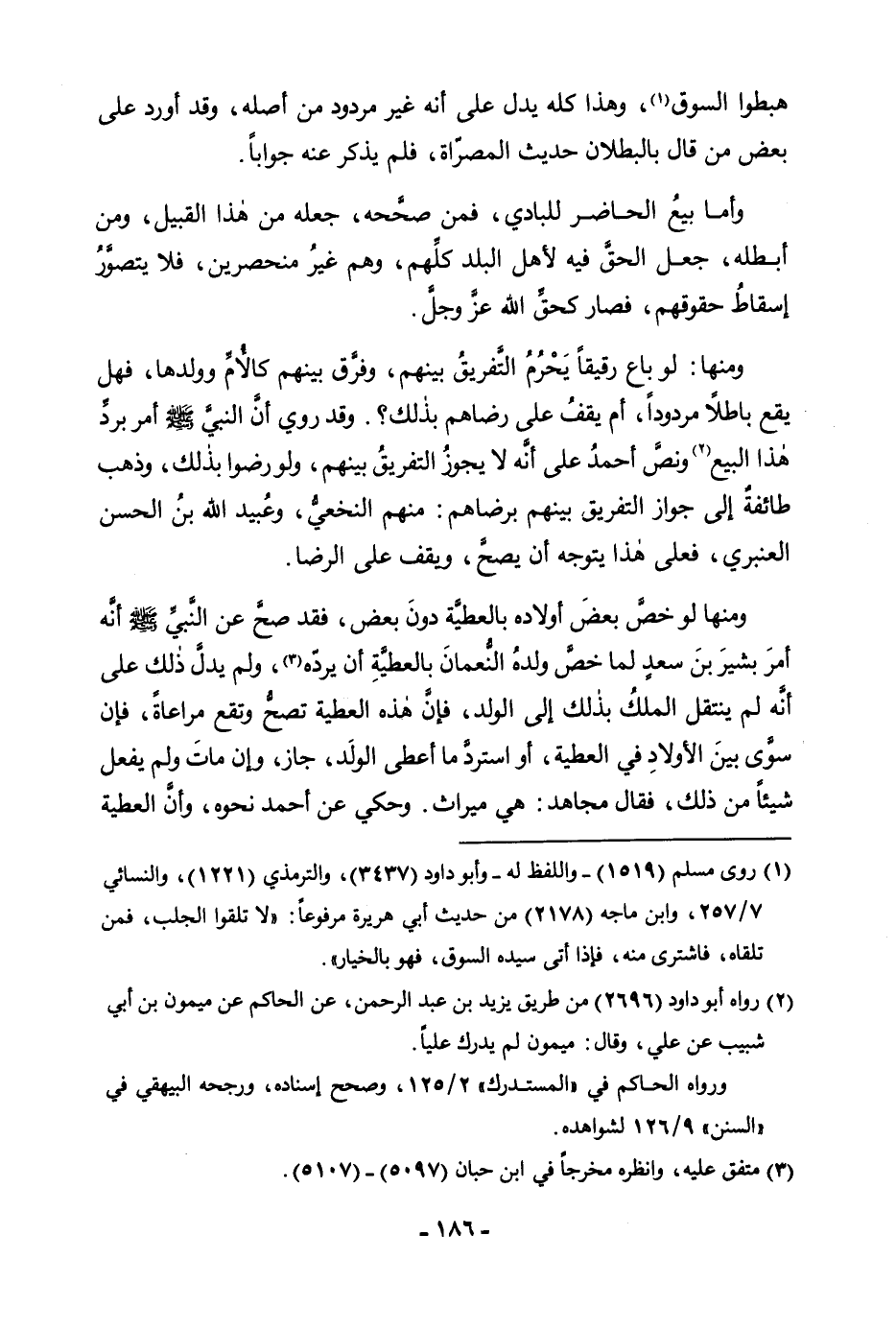 هَبَطُوا السُّوقَ» ، وَهَذَا كُلُّهُ يَدُلُّ عَلَى أَنَّهُ غَيْرُ مَرْدُودٍ مِنْ أَصْلِهِ، وَقَدْ أَوْرَدَ عَلَى بَعْضِ مَنْ قَالَ بِالْبُطْلَانِ حَدِيثَ الْمُصَرَّاةِ، فَلَمْ يَذْكُرْ عَنْهُ جَوَابًا. وَأَمَّا بَيْعُ الْحَاضِرِ لِلْبَادِي، فَمَنْ صَحَّحَهُ، جَعَلَهُ مِنْ هَذَا الْقَبِيلِ، وَمَنْ أَبْطَلَهُ جَعَلَ الْحَقَّ فِيهِ لِأَهْلِ الْبَلَدِ كُلِّهِمْ، وَهُمْ غَيْرُ مُنْحَصِرِينَ، فَلَا يُتَصَوَّرُ إِسْقَاطُ حُقُوقِهِمْ، فَصَارَ كَحَقِّ اللَّهِ عَزَّ وَجَلَّ. وَمِنْهَا: لَوْ بَاعَ رَقِيقًا يَحْرُمُ التَّفْرِيقُ بَيْنَهُمْ، وَفَرَّقَ بَيْنَهُمْ كَالْأُمِّ وَوَلَدِهَا، فَهَلْ يَقَعُ بَاطِلًا مَرْدُودًا، أَمْ يَقِفُ عَلَى رِضَاهُمْ بِذَلِكَ؟ وَقَدْ رُوِيَ أَنَّ النَّبِيَّ صَلَّى اللَّهُ عَلَيْهِ وَسَلَّمَ أَمَرَ بِرَدِّ هَذَا الْبَيْعِ. وَنَصَّ أَحْمَدُ عَلَى أَنَّهُ لَا يَجُوزُ التَّفْرِيقُ بَيْنَهُمْ، وَلَوْ رَضُوا بِذَلِكَ، وَذَهَبَ طَائِفَةٌ إِلَى جَوَازِ التَّفْرِيقِ بَيْنَهُمْ بِرِضَاهُمْ: مِنْهُمُ النَّخَعِيُّ، وَعُبَيْدُ اللَّهِ بْنُ الْحَسَنِ الْعَنْبَرِيُّ، فَعَلَى هَذَا يَتَوَجَّهُ أَنْ يَصِحَّ وَيَقِفُ عَلَى الرِّضَا. وَمِنْهَا لَوْ خَصَّ بَعْضَ أَوْلَادِهِ بِالْعَطِيَّةِ دُونَ بَعْضٍ، فَقَدْ صَحَّ عَنِ النَّبِيِّ صَلَّى اللَّهُ عَلَيْهِ وَسَلَّمَ أَنَّهُ «أَمَرَ بَشِيرَ بْنَ سَعْدٍ لَمَّا خَصَّ وَلَدَهُ النُّعْمَانَ بِالْعَطِيَّةِ أَنْ يَرُدَّهُ» ، وَلَمْ يَدُلَّ ذَلِكَ عَلَى أَنَّهُ لَمْ يَنْتَقِلِ الْمِلْكُ بِذَلِكَ إِلَى الْوَلَدِ، فَإِنَّ هَذِهِ الْعَطِيَّةَ تَصِحُّ وَتَقَعُ مُرَاعَاةً، فَإِنْ سَوَّى بَيْنَ الْأَوْلَادِ فِي الْعَطِيَّةِ، أَوِ اسْتَرَدَّ مَا أَعْطَى الْوَلَدَ، جَازَ وَإِنْ مَاتَ وَلَمْ يَفْعَلْ شَيْئًا مِنْ ذَلِكَ، فَقَالَ مُجَاهِدٌ: هِيَ مِيرَاثٌ وَحُكِيَ عَنْ أَحْمَدَ نَحْوُهُ، وَأَنَّ الْعَطِيَّةَ