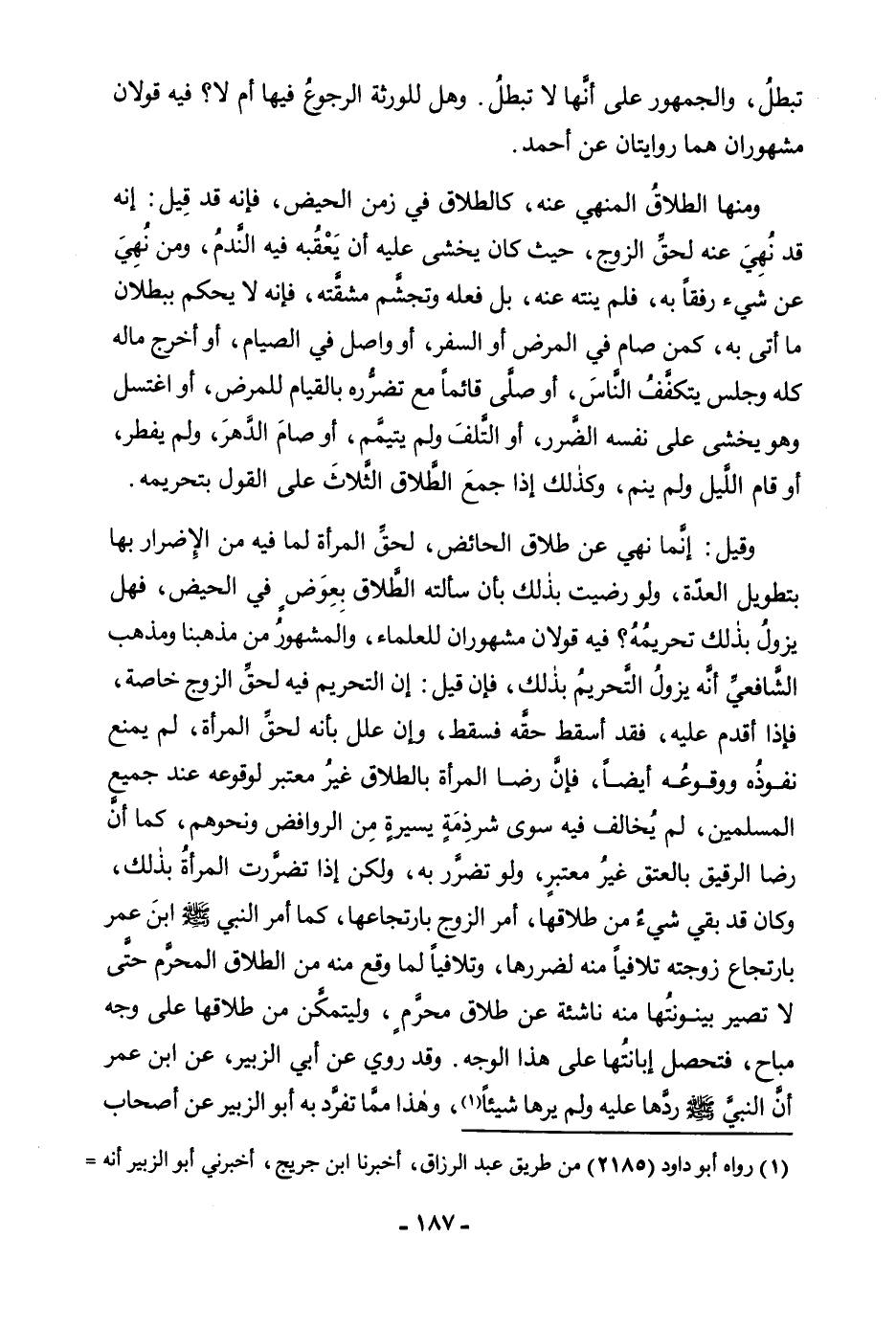 تَبْطُلُ، وَالْجُمْهُورُ عَلَى أَنَّهَا لَا تَبْطُلُ وَهَلْ لِلْوَرَثَةِ الرُّجُوعُ فِيهَا أَمْ لَا؟ فِيهِ قَوْلَانِ مَشْهُورَانِ هُمَا رِوَايَتَانِ عَنْ أَحْمَدَ. وَمِنْهَا الطَّلَاقُ الْمَنْهِيُّ عَنْهُ، كَالطَّلَاقِ فِي زَمَنِ الْحَيْضِ، فَإِنَّهُ قَدْ قِيلَ: إِنَّهُ قَدْ نُهِيَ عَنْهُ لِحَقِّ الزَّوْجِ، حَيْثُ كَانَ يَخْشَى عَلَيْهِ أَنْ يَعْقُبَهُ فِيهِ النَّدَمُ، وَمَنْ نَهَى عَنْ شَيْءٍ رِفْقًا بِهِ، فَلَمْ يَنْتَهِ عَنْهُ بَلْ فَعَلَهُ وَتَجَشَّمَ مَشَقَّتَهُ، فَإِنَّهُ لَا يَحْكُمُ بِبُطْلَانِ مَا أَتَى بِهِ، كَمَنْ صَامَ فِي الْمَرَضِ أَوِ السَّفَرِ، أَوْ وَاصَلَ فِي الصِّيَامِ، أَوْ أَخْرَجَ مَالَهُ وَجَلَسَ يَتَكَفَّفُ النَّاسَ، أَوْ صَلَّى قَائِمًا مَعَ تَضَرُّرِهِ بِالْقِيَامِ لِلْمَرَضِ، أَوِ اغْتَسَلَ وَهُوَ يَخْشَى عَلَى نَفْسِهِ الضَّرَرَ أَوِ التَّلَفَ وَلَمْ يَتَيَمَّمْ، أَوْ صَامَ الدَّهْرَ وَلَمْ يُفْطِرْ، أَوْ قَامَ اللَّيْلَ وَلَمْ يَنَمْ، وَكَذَلِكَ إِذَا جَمَعَ الطَّلَاقَ الثَّلَاثَ عَلَى الْقَوْلِ بِتَحْرِيمِهِ. وَقِيلَ: إِنَّمَا نُهِيَ عَنْ طَلَاقِ الْحَائِضِ لِحَقِّ الْمَرْأَةِ لِمَا فِيهِ مِنَ الْإِضْرَارِ بِهَا بِتَطْوِيلِ الْعِدَّةِ، وَلَوْ رَضِيَتْ بِذَلِكَ بِأَنْ سَأَلَتْهُ الطَّلَاقَ بِعِوَضٍ فِي الْحَيْضِ، فَهَلْ يَزُولُ بِذَلِكَ تَحْرِيمُهُ؟ فِيهِ قَوْلَانِ مَشْهُورَانِ لِلْعُلَمَاءِ، وَالْمَشْهُورُ مِنْ مَذْهَبِنَا وَمَذْهَبِ الشَّافِعِيِّ أَنَّهُ يَزُولُ التَّحْرِيمُ بِذَلِكَ، فَإِنْ قِيلَ: إِنَّ التَّحْرِيمَ فِيهِ لِحَقِّ الزَّوْجِ خَاصَّةً، فَإِذَا أَقْدَمَ عَلَيْهِ فَقَدْ أَسْقَطَ حَقَّهُ فَسَقَطَ، وَإِنْ عَلَّلَ بِأَنَّهُ لِحَقِّ الْمَرْأَةِ لَمْ يَمْنَعْ نُفُوذُهُ وَوُقُوعُهُ أَيْضًا، فَإِنَّ رِضَا الْمَرْأَةِ بِالطَّلَاقِ غَيْرُ مُعْتَبَرٍ لِوُقُوعِهِ عِنْدَ جَمِيعِ الْمُسْلِمِينَ، لَمْ يُخَالِفْ فِيهِ سِوَى شِرْذِمَةٍ يَسِيرَةٍ مِنَ الرَّوَافِضِ وَنَحْوِهِمْ، كَمَا أَنَّ رِضَا الرَّقِيقِ بِالْعِتْقِ غَيْرُ مُعْتَبَرٍ، وَلَوْ تَضَرَّرَ بِهِ، وَلَكِنْ إِذَا تَضَرَّرَتِ الْمَرْأَةُ بِذَلِكَ، وَكَانَ قَدْ بَقِيَ شَيْءٌ مِنْ طَلَاقِهَا، أُمِرَ الزَّوْجُ بِارْتِجَاعِهَا، كَمَا أَمَرَ النَّبِيُّ صَلَّى اللَّهُ عَلَيْهِ وَسَلَّمَ ابْنَ عُمَرَ بِارْتِجَاعِ زَوْجَتِهِ تَلَافِيًا مِنْهُ لِضَرَرِهَا، وَتَلَافِيًا لِمَا وَقَعَ مِنْهُ مِنَ الطَّلَاقِ الْمُحَرَّمِ حَتَّى لَا تَصِيرَ بَيْنُونَتُهَا مِنْهُ نَاشِئَةً عَنْ طَلَاقٍ مُحَرَّمٍ، وَلِيَتَمَكَّنَ مِنْ طَلَاقِهَا عَلَى وَجْهٍ مُبَاحٍ، فَتَحْصُلُ إِبَانَتُهَا عَلَى هَذَا الْوَجْهِ. وَقَدْ رُوِيَ عَنْ أَبِي الزُّبَيْرِ، عَنِ ابْنِ عُمَرَ أَنَّ النَّبِيَّ صَلَّى اللَّهُ عَلَيْهِ وَسَلَّمَ رَدَّهَا عَلَيْهِ وَلَمْ يَرَهَا شَيْئًا، وَهَذَا مِمَّا تَفَرَّدَ بِهِ أَبُو الزُّبَيْرِ عَنْ أَصْحَابِ