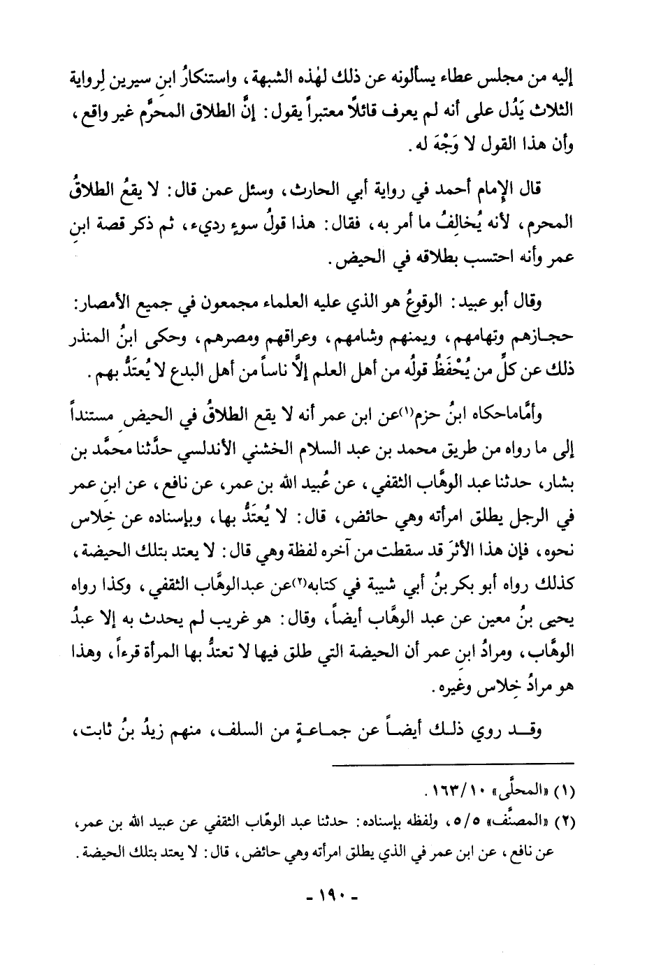 إِلَيْهِ مِنْ مَجْلِسِ عَطَاءٍ يَسْأَلُونَهُ عَنْ ذَلِكَ لِهَذِهِ الشُّبْهَةِ، وَاسْتِنْكَارُ ابْنِ سِيرِينَ لِرِوَايَةِ الثَّلَاثِ يَدُلُّ عَلَى أَنَّهُ لَمْ يَعْرِفْ قَائِلًا مُعْتَبَرًا يَقُولُ: إِنَّ الطَّلَاقَ الْمُحَرَّمَ غَيْرُ وَاقِعٍ، وَأَنَّ هَذَا الْقَوْلَ لَا وَجْهَ لَهُ. قَالَ الْإِمَامُ أَحْمَدُ: فِي رِوَايَةِ أَبِي الْحَارِثِ، وَسُئِلَ عَمَّنْ قَالَ: لَا يَقَعُ الطَّلَاقُ الْمُحَرَّمُ، لِأَنَّهُ يُخَالِفُ مَا أَمَرَ بِهِ، فَقَالَ: هَذَا قَوْلُ سُوءٍ رَدِيءٌ، ثُمَّ ذَكَرَ قِصَّةَ ابْنِ عُمَرَ وَأَنَّهُ احْتَسَبَ بِطَلَاقِهِ فِي الْحَيْضِ. وَقَالَ أَبُو عُبَيْدٍ: الْوُقُوعُ هُوَ الَّذِي عَلَيْهِ الْعُلَمَاءُ مُجْمِعُونَ فِي جَمِيعِ الْأَمْصَارِ حِجَازِهِمْ وَتِهَامِهِمْ، وَيَمَنِهِمْ وَشَامِهِمْ، وَعِرَاقِهِمْ وَمِصْرِهِمْ، وَحَكَى ابْنُ الْمُنْذِرِ ذَلِكَ عَنْ كُلِّ مَنْ يُحْفَظُ قَوْلُهُ مِنْ أَهْلِ الْعِلْمِ إِلَّا نَاسًا مِنْ أَهْلِ الْبِدَعِ لَا يُعْتَدُّ بِهِمْ. وَأَمَّا مَا حَكَاهُ ابْنُ حَزْمٍ عَنِ ابْنِ عُمَرَ أَنَّهُ لَا يَقَعُ الطَّلَاقُ فِي الْحَيْضِ مُسْتَنِدًا إِلَى مَا رَوَاهُ مِنْ طَرِيقِ مُحَمَّدِ بْنِ عَبْدِ السَّلَامِ الْخُشَنِيِّ الْأَنْدَلُسِيِّ حَدَّثَنَا مُحَمَّدُ بْنُ بَشَّارٍ، حَدَّثَنَا عَبْدُ الْوَهَّابِ الثَّقَفِيُّ، عَنْ عُبَيْدِ اللَّهِ بْنِ عُمَرَ، عَنْ نَافِعٍ، «عَنِ ابْنِ عُمَرَ فِي الرَّجُلِ يُطَلِّقُ امْرَأَتَهُ وَهِيَ حَائِضٌ، قَالَ: لَا يُعْتَدُّ بِهَا» ، وَبِإِسْنَادِهِ، عَنْ خِلَاسٍ نَحْوَهُ، فَإِنَّ هَذَا الْأَثَرَ قَدْ سَقَطَتْ مِنْ آخِرِهِ لَفْظَةٌ وَهِيَ قَالَ: لَا يُعْتَدُّ بِتِلْكَ الْحَيْضَةِ، كَذَلِكَ رَوَاهُ أَبُو بَكْرِ بْنُ أَبِي شَيْبَةَ فِي كِتَابِهِ عَنْ عَبْدِ الْوَهَّابِ الثَّقَفِيِّ، وَكَذَا رَوَاهُ يَحْيَى بْنُ مَعِينٍ عَنْ عَبْدِ الْوَهَّابِ أَيْضًا، وَقَالَ: هُوَ غَرِيبٌ لَمْ يُحَدِّثْ بِهِ إِلَّا عَبْدُ الْوَهَّابِ، وَمُرَادُ ابْنِ عُمَرَ أَنَّ الْحَيْضَةَ الَّتِي طَلَّقَ فِيهَا لَا تَعْتَدُّ بِهَا الْمَرْأَةُ قُرْءًا، وَهَذَا هُوَ مُرَادُ خِلَاسٍ وَغَيْرِهِ. وَقَدْ رُوِيَ ذَلِكَ أَيْضًا عَنْ جَمَاعَةٍ مِنَ السَّلَفِ، مِنْهُمْ زَيْدُ بْنُ ثَابِتٍ،