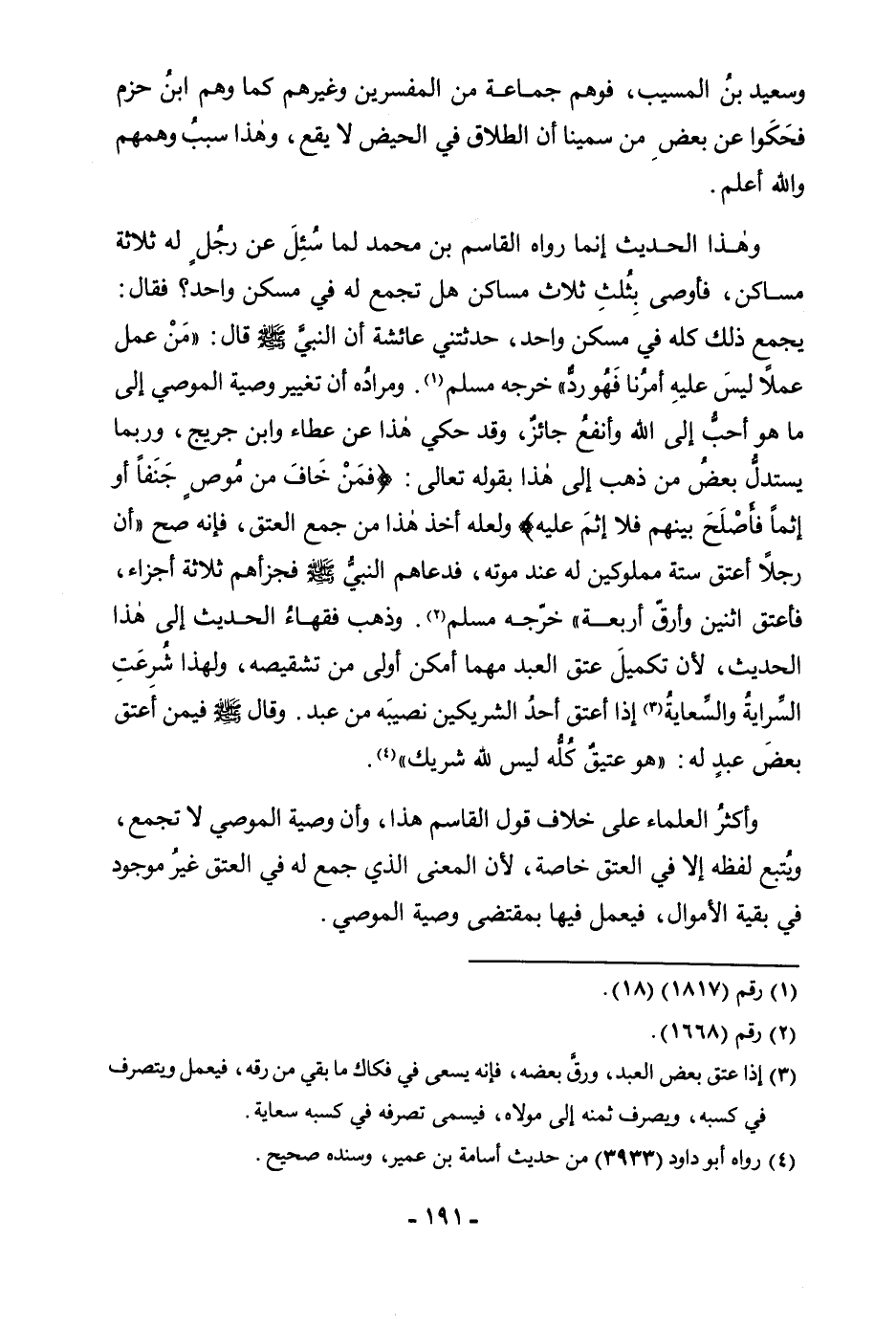 وَسَعِيدُ بْنُ الْمُسَيَّبِ، فَوَهِمَ جَمَاعَةٌ مِنَ الْمُفَسِّرِينَ وَغَيْرِهِمْ، كَمَا وَهِمَ ابْنُ حَزْمٍ، فَحَكَوْا عَنْ بَعْضِ مَنْ سَمَّيْنَا أَنَّ الطَّلَاقَ فِي الْحَيْضِ لَا يَقَعُ، وَهَذَا سَبَبُ وَهْمِهِمْ وَاللَّهُ أَعْلَمُ. وَهَذَا الْحَدِيثُ إِنَّمَا رَوَاهُ الْقَاسِمُ بْنُ مُحَمَّدٍ لَمَّا سُئِلَ عَنْ رَجُلٍ لَهُ ثَلَاثَةُ مَسَاكِنَ، فَأَوْصَى بِثُلُثِ ثَلَاثِ مَسَاكِنَ هَلْ تُجْمَعُ لَهُ فِي مَسْكَنٍ وَاحِدٍ؟ فَقَالَ: تُجْمَعُ لَهُ فِي مَسْكَنٍ وَاحِدٍ، حَدَّثَتْنِي عَائِشَةُ أَنَّ النَّبِيَّ صَلَّى اللَّهُ عَلَيْهِ وَسَلَّمَ قَالَ: «مَنْ عَمِلَ عَمَلًا لَيْسَ عَلَيْهِ أَمْرُنَا فَهُوَ رَدٌّ» خَرَّجَهُ مُسْلِمٌ. وَمُرَادُهُ أَنَّ تَغْيِيرَ وَصِيَّةِ الْمُوصِي إِلَى مَا هُوَ أَحَبُّ إِلَى اللَّهِ وَأَنْفَعُ جَائِزٌ، وَقَدْ حُكِيَ هَذَا عَنْ عَطَاءٍ وَابْنِ جُرَيْجٍ، وَرُبَّمَا يَسْتَدِلُّ بَعْضُ مَنْ ذَهَبَ إِلَى هَذَا بِقَوْلِهِ تَعَالَى: {فَمَنْ خَافَ مِنْ مُوصٍ جَنَفًا أَوْ إِثْمًا فَأَصْلَحَ بَيْنَهُمْ فَلَا إِثْمَ عَلَيْهِ} [البقرة: 182] وَلَعَلَّهُ أَخَذَ هَذَا مِنْ جَمْعِ الْعِتْقِ، فَإِنَّهُ صَحَّ " «أَنَّ رَجُلًا أَعْتَقَ سِتَّةَ مَمْلُوكِينَ لَهُ عِنْدَ مَوْتِهِ، فَدَعَاهُمُ النَّبِيُّ صَلَّى اللَّهُ عَلَيْهِ وَسَلَّمَ فَجَزَّأَهُمْ ثَلَاثَةَ أَجْزَاءٍ، فَأَعْتَقَ اثْنَيْنِ وَأَرَقَّ أَرْبَعَةً» " خَرَّجَهُ مُسْلِمٌ. وَذَهَبَ فُقَهَاءُ الْحَدِيثِ إِلَى هَذَا الْحَدِيثِ؛ لِأَنَّ تَكْمِيلَ عِتْقِ الْعَبْدِ مَهْمَا أَمْكَنَ أَوْلَى مِنْ تَشْقِيصِهِ، وَلِهَذَا شُرِعَتِ السَّرَايَةُ وَالسِّعَايَةُ إِذَا أَعْتَقَ أَحَدَ الشَّرِيكَيْنِ نَصِيبَهُ مِنْ عَبْدٍ. «وَقَالَ صَلَّى اللَّهُ عَلَيْهِ وَسَلَّمَ فِيمَنْ أَعْتَقَ بَعْضَ عَبْدٍ لَهُ: هُوَ عَتِيقٌ كُلُّهُ لَيْسَ لِلَّهِ شَرِيكٌ» . وَأَكْثَرُ الْعُلَمَاءِ عَلَى خِلَافِ قَوْلِ الْقَاسِمِ هَذَا، وَأَنَّ وَصِيَّةَ الْمُوصِي لَا تُجْمَعُ، وَيُتْبَعُ لَفْظُهُ إِلَّا فِي الْعِتْقِ خَاصَّةً، لِأَنَّ الْمَعْنَى الَّذِي جَمَعَ لَهُ فِي الْعِتْقِ غَيْرُ مَوْجُودٍ فِي بَقِيَّةِ الْأَمْوَالِ، فَيَعْمَلُ فِيهَا بِمُقْتَضَى وَصِيَّةِ الْمُوصِي.