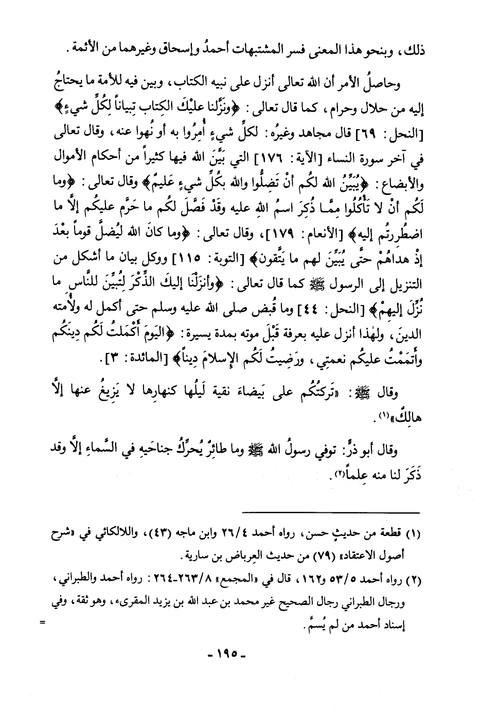 ذَلِكَ، وَبِنَحْوِ هَذَا الْمَعْنَى فَسَّرَ الْمُشْتَبِهَاتِ أَحْمَدُ وَإِسْحَاقُ وَغَيْرُهُمَا مِنَ الْأَئِمَّةِ. وَحَاصِلُ الْأَمْرِ أَنَّ اللَّهَ تَعَالَى أَنْزَلَ عَلَى نَبِيِّهِ الْكِتَابَ، وَبَيَّنَ فِيهِ لِلْأُمَّةِ مَا يَحْتَاجُ إِلَيْهِ مِنْ حَلَالٍ وَحَرَامٍ، كَمَا قَالَ تَعَالَى: {وَنَزَّلْنَا عَلَيْكَ الْكِتَابَ تِبْيَانًا لِكُلِّ شَيْءٍ} [النحل: 89] (النَّحْلِ: 89) قَالَ مُجَاهِدٌ وَغَيْرُهُ: كُلُّ شَيْءٍ أَمَرُوا بِهِ أَوْ نَهَوْا عَنْهُ، وَقَالَ تَعَالَى فِي آخِرِ سُورَةِ النِّسَاءِ (الْآيَةَ: 176) الَّتِي بَيَّنَ فِيهَا كَثِيرًا مِنْ أَحْكَامِ الْأَمْوَالِ وَالْأَبْضَاعِ: {يُبَيِّنُ اللَّهُ لَكُمْ أَنْ تَضِلُّوا وَاللَّهُ بِكُلِّ شَيْءٍ عَلِيمٌ} [النساء: 176] وَقَالَ تَعَالَى: {وَمَا لَكُمْ أَلَّا تَأْكُلُوا مِمَّا ذُكِرَ اسْمُ اللَّهِ عَلَيْهِ وَقَدْ فَصَّلَ لَكُمْ مَا حَرَّمَ عَلَيْكُمْ إِلَّا مَا اضْطُرِرْتُمْ إِلَيْهِ} [الأنعام: 119] (الْأَنِعَامِ: 119) ، وَقَالَ تَعَالَى: {وَمَا كَانَ اللَّهُ لِيُضِلَّ قَوْمًا بَعْدَ إِذْ هَدَاهُمْ حَتَّى يُبَيِّنَ لَهُمْ مَا يَتَّقُونَ} [التوبة: 115] (التَّوْبَةِ: 115) وَوَكَّلَ بَيَانَ مَا أَشْكَلَ مِنَ التَّنْزِيلِ إِلَى الرَّسُولِ صَلَّى اللَّهُ عَلَيْهِ وَسَلَّمَ كَمَا قَالَ تَعَالَى: {وَأَنْزَلْنَا إِلَيْكَ الذِّكْرَ لِتُبَيِّنَ لِلنَّاسِ مَا نُزِّلَ إِلَيْهِمْ} [النحل: 44] (النَّحْلِ: 44) وَمَا قُبِضَ صَلَّى اللَّهُ عَلَيْهِ وَسَلَّمَ حَتَّى أَكْمَلَ لَهُ وَلِأُمَّتِهِ الدِّينَ، وَلِهَذَا أُنْزِلَ عَلَيْهِ بِعَرَفَةَ قَبْلَ مَوْتِهِ بِمُدَّةٍ يَسِيرَةٍ: {الْيَوْمَ أَكْمَلْتُ لَكُمْ دِينَكُمْ وَأَتْمَمْتُ عَلَيْكُمْ نِعْمَتِي وَرَضِيتُ لَكُمُ الْإِسْلَامَ دِينًا} [المائدة: 3] (الْمَائِدَةِ: 3) . وَقَالَ صَلَّى اللَّهُ عَلَيْهِ وَسَلَّمَ «تَرَكْتُكُمْ عَلَى بَيْضَاءَ نَقِيَّةٍ لَيْلُهَا كَنَهَارِهَا لَا يَزِيغُ عَنْهَا إِلَّا هَالِكٌ» . وَقَالَ أَبُو ذَرٍّ: تُوُفِّيَ رَسُولُ اللَّهِ صَلَّى اللَّهُ عَلَيْهِ وَسَلَّمَ وَمَا طَائِرٌ يُحَرِّكُ جَنَاحَيْهِ فِي السَّمَاءِ إِلَّا وَقَدْ ذَكَرَ لَنَا مِنْهُ عِلْمًا.