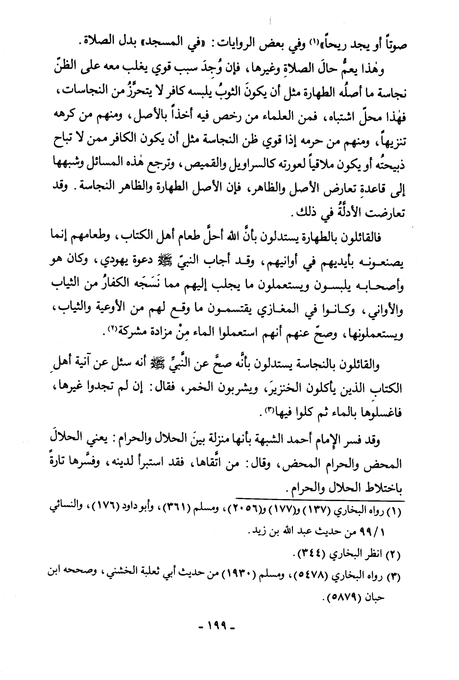 صَوْتًا أَوْ يَجِدَ رِيحًا» وَفِي بَعْضِ الرِّوَايَاتِ: " فِي الْمَسْجِدِ " بَدَلَ الصَّلَاةِ. وَهَذَا يَعُمُّ حَالَ الصَّلَاةِ وَغَيْرِهَا، فَإِنْ وُجِدَ سَبَبٌ قَوِيٌّ يُغَلِّبُ مَعَهُ عَلَى الظَّنِّ نَجَاسَةَ مَا أَصْلُهُ الطَّهَارَةُ مِثْلَ أَنْ يَكُونَ الثَّوْبُ يَلْبَسُهُ كَافِرٌ لَا يَتَحَرَّزُ مِنَ النَّجَاسَاتِ، فَهَذَا مَحَلُّ اشْتِبَاهٍ، فَمِنَ الْعُلَمَاءِ مَنْ رَخَّصَ فِيهِ أَخْذًا بِالْأَصْلِ، وَمِنْهُمْ مَنْ كَرِهَهُ تَنْزِيهًا، وَمِنْهُمْ مَنْ حَرَّمَهُ إِذَا قَوِيَ ظَنُّ النَّجَاسَةِ مِثْلَ أَنْ يَكُونَ الْكَافِرُ مِمَّنْ لَا تُبَاحُ ذَبِيحَتُهُ أَوْ يَكُونُ مُلَاقِيًا لِعَوْرَتِهِ كَالسَّرَاوِيلِ وَالْقَمِيصِ، وَتَرْجِعُ هَذِهِ الْمَسَائِلُ وَشَبَهُهَا عَلَى قَاعِدَةِ تَعَارُضِ الْأَصْلِ وَالظَّاهِرِ، فَإِنَّ الْأَصْلَ الطَّهَارَةُ وَالظَّاهِرُ النَّجَاسَةُ وَقَدْ تَعَارَضَتِ الْأَدِلَّةُ فِي ذَلِكَ. فَالْقَائِلُونَ بِالطَّهَارَةِ يَسْتَدِلُّونَ بِأَنَّ اللَّهَ تَعَالَى أَحَلَّ طَعَامَ أَهْلِ الْكِتَابِ، وَطَعَامُهُمْ إِنَّمَا يَصْنَعُونَهُ بِأَيْدِيهِمْ فِي أَوَانِيهِمْ، وَقَدْ أَجَابَ النَّبِيُّ صَلَّى اللَّهُ عَلَيْهِ وَسَلَّمَ دَعْوَةَ يَهُودِيٍّ، وَكَانَ هُوَ وَأَصْحَابُهُ يَلْبَسُونَ وَيَسْتَعْمِلُونَ مَا يُجْلَبُ إِلَيْهِمْ مِمَّا يَنْسِجُهُ الْكَفَّارُ بِأَيْدِيهِمْ مِنَ الثِّيَابِ وَالْأَوَانِي، وَكَانُوا فِي الْمَغَازِي يَقْتَسِمُونَ مَا وَقَعَ لَهُمْ مِنَ الْأَوْعِيَةِ، وَالثِّيَابِ وَيَسْتَعْمِلُونَهَا، وَصَحَّ عَنْهُمْ أَنَّهُمُ اسْتَعْمَلُوا الْمَاءَ مِنْ مَزَادَةِ مُشْرِكَةٍ. وَالْقَائِلُونَ بِالنَّجَاسَةِ يَسْتَدِلُّونَ بِأَنَّهُ صَحَّ عَنِ النَّبِيِّ صَلَّى اللَّهُ عَلَيْهِ وَسَلَّمَ أَنَّهُ «سُئِلَ عَنْ آنِيَةِ أَهْلِ الْكِتَابِ الَّذِينَ يَأْكُلُونَ الْخِنْزِيرَ، وَيَشْرَبُونَ الْخَمْرَ، فَقَالَ: إِنْ لَمْ تَجِدُوا غَيْرَهَا، فَاغْسِلُوهَا بِالْمَاءِ ثُمَّ كُلُوا فِيهَا» . وَقَدْ فَسَّرَ الْإِمَامُ أَحْمَدُ الشُّبْهَةَ بِأَنَّهَا مَنْزِلَةٌ بَيْنَ الْحَلَالِ وَالْحَرَامِ: يَعْنِي الْحَلَالَ الْمَحْضَ وَالْحَرَامَ الْمَحْضَ، وَقَالَ: مَنِ اتَّقَاهَا، فَقَدِ اسْتَبْرَأَ لِدِينِهِ، وَفَسَّرَهَا تَارَةً بِاخْتِلَاطِ الْحَلَالِ وَالْحَرَامِ.