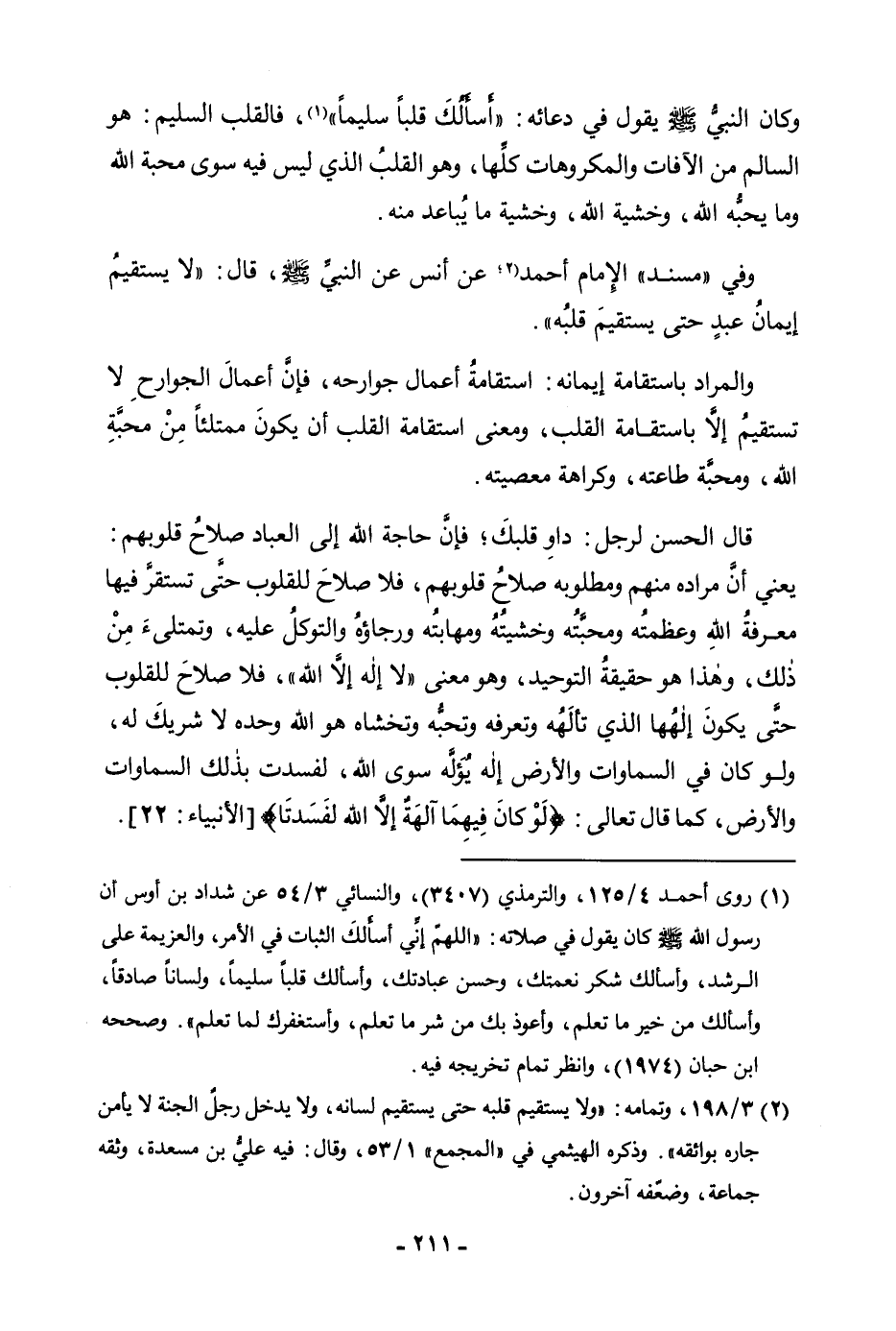 وَكَانَ النَّبِيُّ صَلَّى اللَّهُ عَلَيْهِ وَسَلَّمَ يَقُولُ فِي دُعَائِهِ: " «أَسْأَلُكَ قَلْبًا سَلِيمًا» "، فَالْقَلْبُ السَّلِيمُ: هُوَ السَّالِمُ مِنَ الْآفَاتِ وَالْمَكْرُوهَاتِ كُلِّهَا، وَهُوَ الْقَلْبُ الَّذِي لَيْسَ فِيهِ سِوَى مَحَبَّةِ اللَّهِ وَمَا يُحِبُّهُ اللَّهُ، وَخَشْيَةِ اللَّهِ، وَخَشْيَةِ مَا يُبَاعِدُ مِنْهُ. وَفِي " مُسْنَدِ " الْإِمَامِ أَحْمَدَ عَنْ أَنَسٍ، عَنِ النَّبِيِّ صَلَّى اللَّهُ عَلَيْهِ وَسَلَّمَ، قَالَ: «لَا يَسْتَقِيمُ إِيمَانُ عَبْدٍ حَتَّى يَسْتَقِيمَ قَلْبُهُ» . وَالْمُرَادُ بِاسْتِقَامَةِ إِيمَانِهِ: اسْتِقَامَةُ أَعْمَالِ جَوَارِحِهِ، فَإِنَّ أَعْمَالَ جَوَارِحِهِ لَا تَسْتَقِيمُ إِلَّا بِاسْتِقَامَةِ الْقَلْبِ، وَمَعْنَى اسْتِقَامَةِ الْقَلْبِ أَنْ يَكُونَ مُمْتَلِئًا مِنْ مَحَبَّةِ اللَّهِ، وَمَحَبَّةِ طَاعَتِهِ، وَكَرَاهَةِ مَعْصِيَتِهِ. وَقَالَ الْحَسَنُ لِرَجُلٍ: دَاوِ قَلْبَكَ؛ فَإِنَّ حَاجَةَ اللَّهِ إِلَى الْعِبَادِ صَلَاحُ قُلُوبِهِمْ: يَعْنِي أَنَّ مُرَادَهُ مِنْهُمْ وَمَطْلُوبَهُ صَلَاحُ قُلُوبِهِمْ، فَلَا صَلَاحَ لِلْقُلُوبِ حَتَّى يَسْتَقِرَّ فِيهَا مَعْرِفَةُ اللَّهِ وَعَظَمَتُهُ وَمَحَبَّتُهُ وَخَشْيَتُهُ وَمَهَابَتُهُ وَرَجَاؤُهُ وَالتَّوَكُّلُ عَلَيْهِ، وَتَمْتَلِئَ مِنْ ذَلِكَ، وَهَذَا هُوَ حَقِيقَةُ التَّوْحِيدِ، وَهُوَ مَعْنَى قَوْلِ " لَا إِلَهَ إِلَّا اللَّهُ " فَلَا صَلَاحَ لِلْقُلُوبِ حَتَّى يَكُونَ إِلَهُهَا الَّذِي تَأْلَهُهُ وَتَعْرِفُهُ وَتُحِبُّهُ وَتَخْشَاهُ هُوَ اللَّهَ وَحْدَهُ لَا شَرِيكَ لَهُ، وَلَوْ كَانَ فِي السَّمَاوَاتِ وَالْأَرْضِ إِلَهٌ يُؤَلَّهُ سِوَى اللَّهِ، لَفَسَدَتْ بِذَلِكَ السَّمَاوَاتُ وَالْأَرْضُ كَمَا قَالَ تَعَالَى: {لَوْ كَانَ فِيهِمَا آلِهَةٌ إِلَّا اللَّهُ لَفَسَدَتَا} [الأنبياء: 22] (الْأَنْبِيَاءِ: 22) .