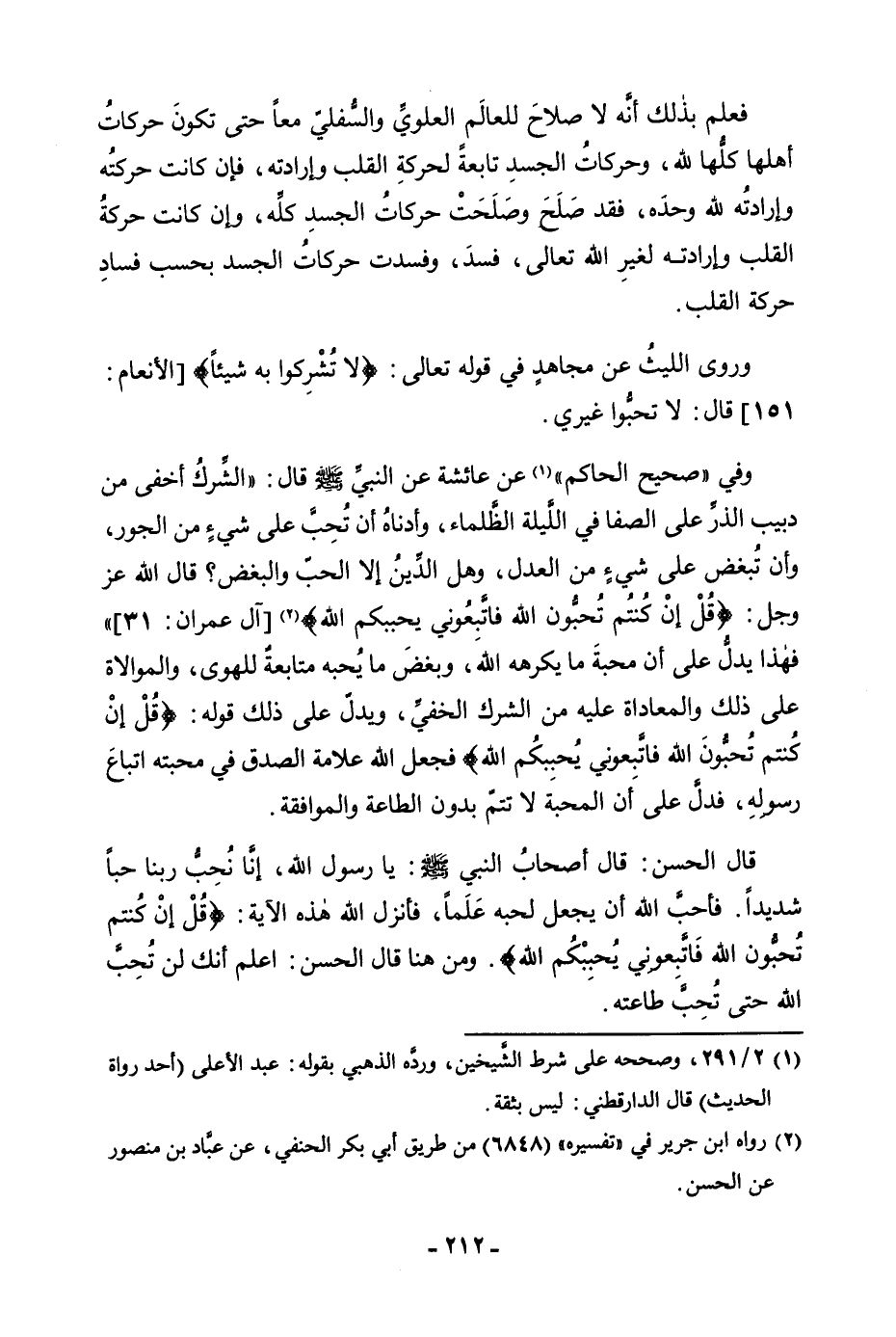 فَعِلْمَ بِذَلِكَ أَنَّهُ لَا صَلَاحَ لِلْعَالَمِ الْعُلْوِيِّ وَالسُّفْلِيِّ مَعًا حَتَّى تَكُونَ حَرَكَاتُ أَهْلِهَا كُلُّهَا لِلَّهِ، وَحَرَكَاتُ الْجَسَدِ تَابِعَةٌ لِحَرَكَةِ الْقَلْبِ وَإِرَادَتِهِ، فَإِنْ كَانَتْ حَرَكَتُهُ وَإِرَادَتُهُ لِلَّهِ وَحْدَهُ، فَقَدْ صَلَحَ وَصَلَحَتْ حَرَكَاتُ الْجَسَدِ كُلِّهُ، وَإِنْ كَانَتْ حَرَكَةُ الْقَلْبِ وَإِرَادَاتُهُ لِغَيْرِ اللَّهِ تَعَالَى، فَسَدَ، وَفَسَدَتْ حَرَكَاتُ الْجَسَدِ بِحَسَبِ فَسَادِ حَرَكَةِ الْقَلْبِ. وَرَوَى اللَّيْثُ، عَنْ مُجَاهِدٍ فِي قَوْلِهِ تَعَالَى {أَلَّا تُشْرِكُوا بِهِ شَيْئًا} [الأنعام: 151] (الْأَنْعَامِ: 151) قَالَ: لَا تُحِبُّوا غَيْرِي. وَفِي " صَحِيحِ الْحَاكِمِ " عَنْ عَائِشَةَ، عَنِ النَّبِيِّ صَلَّى اللَّهُ عَلَيْهِ وَسَلَّمَ قَالَ: «الشَّرَكُ أَخْفَى مِنْ دَبِيبِ الذَّرِّ عَلَى الصَّفَا فِي اللَّيْلَةِ الظَّلْمَاءِ، وَأَدْنَاهُ أَنْ تُحِبَّ عَلَى شَيْءٍ مِنَ الْجَوْرِ، وَأَنْ تُبْغِضَ عَلَى شَيْءٍ مِنَ الْعَدْلِ، وَهَلِ الدِّينُ إِلَّا الْحُبُّ وَالْبُغْضُ؟ قَالَ اللَّهُ عَزَّ وَجَلَّ: {قُلْ إِنْ كُنْتُمْ تُحِبُّونَ اللَّهَ فَاتَّبِعُونِي يُحْبِبْكُمُ اللَّهُ} [آل عمران: 31] (آلِ عِمْرَانَ: 31) » فَهَذَا يَدُلُّ عَلَى أَنَّ مَحَبَّةَ مَا يَكْرَهُهُ اللَّهُ، وَبُغْضَ مَا يُحِبُّهُ مُتَابَعَةٌ لِلْهَوَى، وَالْمُوَالَاةُ عَلَى ذَلِكَ وَالْمُعَادَاةُ عَلَيْهِ مِنَ الشِّرْكِ الْخَفِيِّ، وَيَدُلُّ عَلَى ذَلِكَ قَوْلُهُ: {قُلْ إِنْ كُنْتُمْ تُحِبُّونَ اللَّهَ فَاتَّبِعُونِي يُحْبِبْكُمُ اللَّهُ} [آل عمران: 31] فَجَعَلَ اللَّهُ عَلَامَةَ الصِّدْقِ فِي مَحَبَّتِهِ اتِّبَاعَ رَسُولِهِ، فَدَلَّ عَلَى أَنَّ الْمَحَبَّةَ لَا تَتِمُّ بِدُونِ الطَّاعَةِ وَالْمُوَافَقَةِ. قَالَ الْحَسَنُ: قَالَ أَصْحَابُ رَسُولِ اللَّهِ صَلَّى اللَّهُ عَلَيْهِ وَسَلَّمَ: يَا رَسُولَ اللَّهِ، إِنَّا نُحِبُّ رَبَّنَا حُبًّا شَدِيدًا فَأَحَبَّ اللَّهُ أَنَّ يَجْعَلَ لِحُبِّهِ عَلَمًا، فَأَنْزَلَ اللَّهُ هَذِهِ الْآيَةَ: {قُلْ إِنْ كُنْتُمْ تُحِبُّونَ اللَّهَ فَاتَّبِعُونِي يُحْبِبْكُمُ اللَّهُ} [آل عمران: 31] وَمِنْ هُنَا قَالَ الْحَسَنُ: اعْلَمْ أَنَّكَ لَنْ تُحِبَّ اللَّهَ حَتَّى تُحِبَّ طَاعَتَهُ.