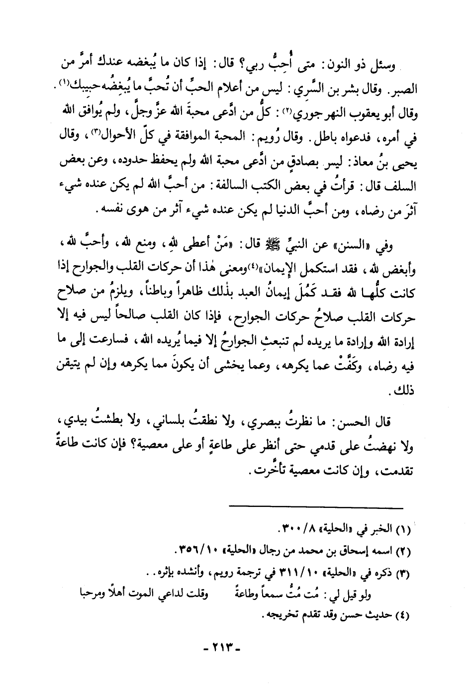 وَسُئِلَ ذُو النُّونِ: مَتَى أُحِبُّ رَبِّي؟ قَالَ: إِذَا كَانَ مَا يُبْغِضُهُ عِنْدَكَ أَمَرَّ مِنَ الصَّبْرِ. وَقَالَ بِشْرُ بْنُ السِّرِيِّ: لَيْسَ مِنْ أَعْلَامِ الْحُبِّ أَنْ تُحِبَّ مَا يُبْغِضُهُ حَبِيبُكَ. قَالَ أَبُو يَعْقُوبَ النَّهْرَجُورِيُّ: كُلُّ مَنِ ادَّعَى مَحَبَّةَ اللَّهِ عَزَّ وَجَلَّ، وَلَمْ يُوَافِقِ اللَّهَ فِي أَمْرِهِ، فَدَعَوَاهُ بَاطِلٌ. وَقَالَ رُوَيْمٌ: الْمَحَبَّةُ الْمُوَافَقَةُ فِي كُلِّ الْأَحْوَالِ، وَقَالَ يَحْيَى بْنُ مُعَاذٍ: لَيْسَ بِصَادِقٍ مَنِ ادَّعَى مَحَبَّةَ اللَّهِ وَلَمْ يَحْفَظْ حُدُودَهُ، وَعَنْ بَعْضِ السَّلَفِ قَالَ: قَرَأْتُ فِي بَعْضِ الْكُتُبِ السَّالِفَةِ: مَنْ أَحَبَّ اللَّهَ لَمْ يَكُنْ عِنْدَهُ شَيْءٌ آثَرَ مِنْ رِضَاهُ، وَمَنْ أَحَبَّ الدُّنْيَا لَمْ يَكُنْ عِنْدَهُ شَيْءٌ آثَرَ مِنْ هَوَى نَفْسِهِ. وَفِي " السُّنَنِ " عَنِ النَّبِيِّ صَلَّى اللَّهُ عَلَيْهِ وَسَلَّمَ قَالَ: «مَنْ أَعْطَى لِلَّهِ، وَمَنَعَ لِلَّهِ، وَأَحَبَّ لِلَّهِ، وَأَبْغَضَ لِلَّهِ، فَقَدِ اسْتَكْمَلَ الْإِيمَانَ» وَمَعْنَى هَذَا أَنَّ كُلَّ حَرَكَاتِ الْقَلْبِ وَالْجَوَارِحِ إِذَا كَانَتْ كُلُّهَا لِلَّهِ فَقَدْ كَمُلَ إِيمَانُ الْعَبْدِ بِذَلِكَ ظَاهِرًا وَبَاطِنًا، وَيَلْزَمُ مِنْ صَلَاحِ حَرَكَاتِ الْقَلْبِ صَلَاحُ حَرَكَاتِ الْجَوَارِحِ، فَإِذَا كَانَ الْقَلْبُ صَالِحًا لَيْسَ فِيهِ إِلَّا إِرَادَةُ اللَّهِ وَإِرَادَةُ مَا يُرِيدُهُ لَمْ تَنْبَعِثِ الْجَوَارِحُ إِلَّا فِيمَا يُرِيدُهُ اللَّهُ، فَسَارَعَتْ إِلَى مَا فِيهِ رِضَاهُ، وَكَفَّتْ عَمَّا يَكْرَهُهُ، وَعَمَّا يَخْشَى أَنْ يَكُونَ مِمَّا يَكْرَهُهُ وَإِنْ لَمْ يَتَيَقَّنْ ذَلِكَ. قَالَ الْحَسَنُ: مَا ضَرَبْتُ بِبَصَرِي، وَلَا نَطَقْتُ بِلِسَانِي، وَلَا بِطَشْتُ بِيَدِي، وَلَا نَهَضْتُ عَلَى قَدَمِي حَتَّى أَنْظُرَ عَلَى طَاعَةٍ أَوْ عَلَى مَعْصِيَةٍ؟ فَإِنْ كَانَتْ طَاعَتُهُ تَقَدَّمَتْ، وَإِنْ كَانَتْ مَعْصِيَةً تَأَخَّرَتْ.